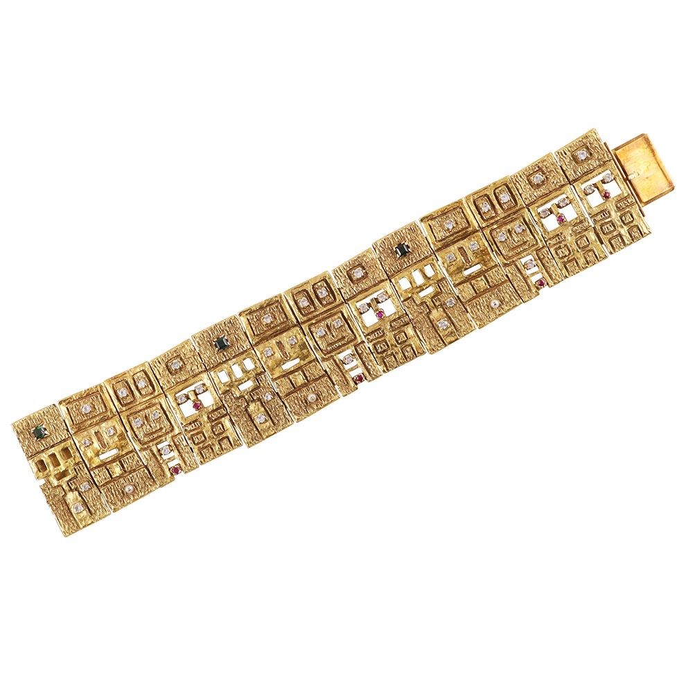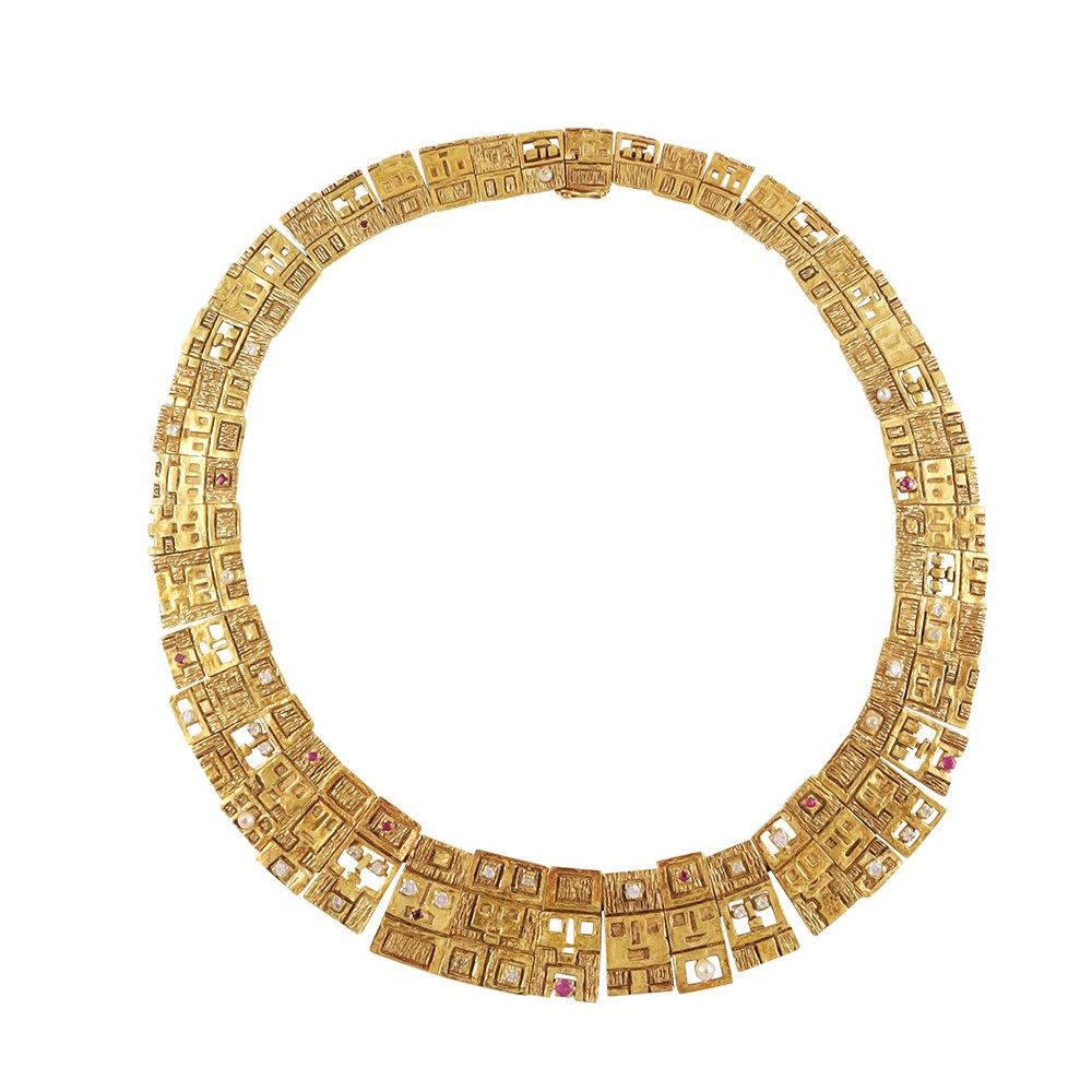 in oro giallo, composta da girocollo, bracciale e spilla formati da elementi geometrici traforati e incisi, con pietre sintetiche, gr. 194,3. Lunghezza girocollo 35 cm, bracciale 17 cm. Dimensione spilla 4 x 3 cm ca. Firmati: A. Frühauf Anton 'Toni' Frühauf (1914 - 1999), noto artista meranese, designer, pittore e caricaturista, terza generazione di una famiglia di orafi, studia alla Scuola di Arti Applicate di Monaco e lavora come orafo a Roma prima di tornare nell'azienda di famiglia a Merano. A partire dagli anni '50 il design innovativo delle sue creazioni cattura l'attenzione internazionale, portandolo a vincere numerosi premi in Italia, Austria, Germania e Giappone. Le sue opere sono esposte nel Museo delle Belle Arti di Boston e nel Museo del Gioiello di Pforzheim .