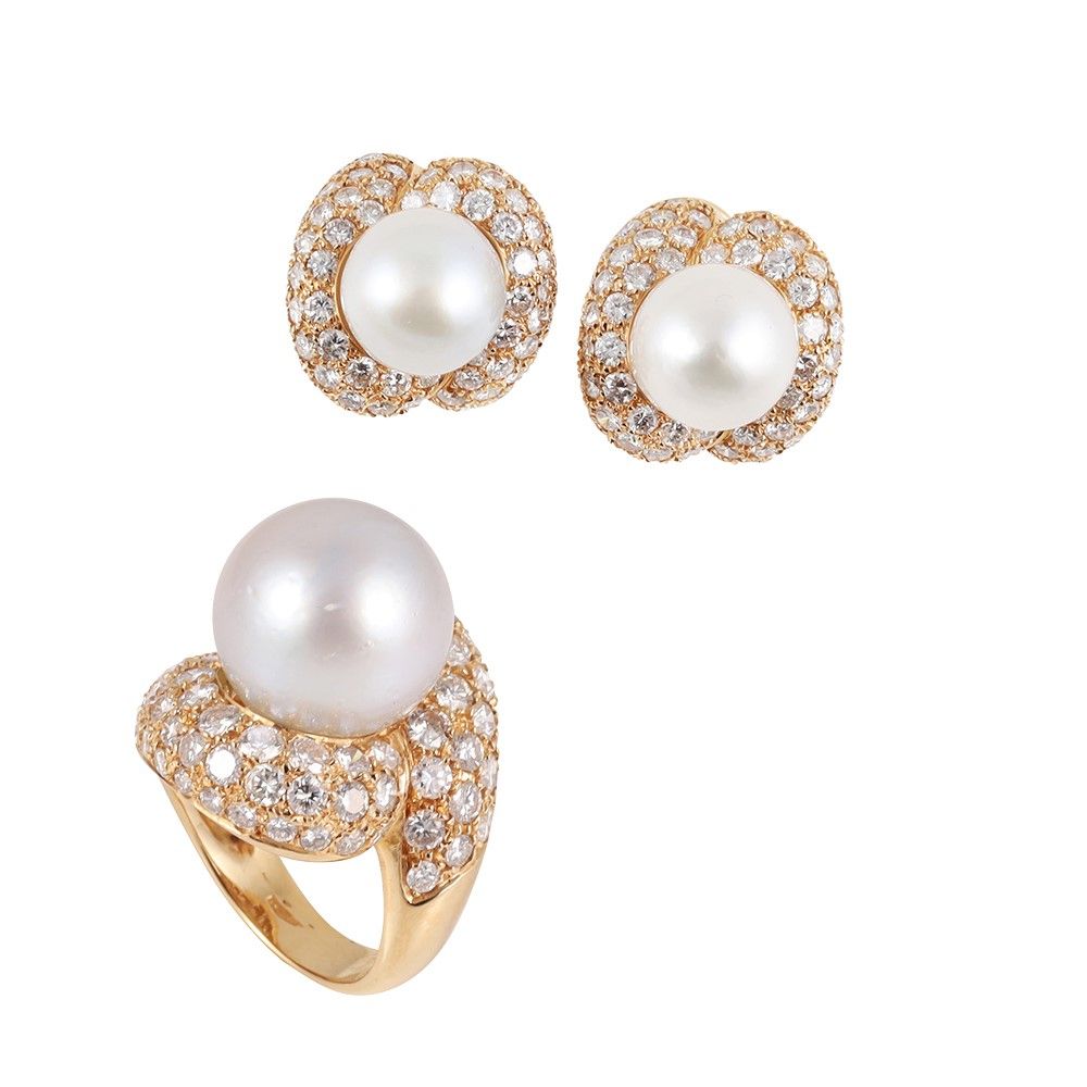 in oro giallo composta da anello e orecchini impreziositi da brillanti del peso complessivo di 8 ct ca. e perle coltivate, gr. complessivi 40,6. Corredata da custodia originale. Misura anello 14 Firmata: Faraone