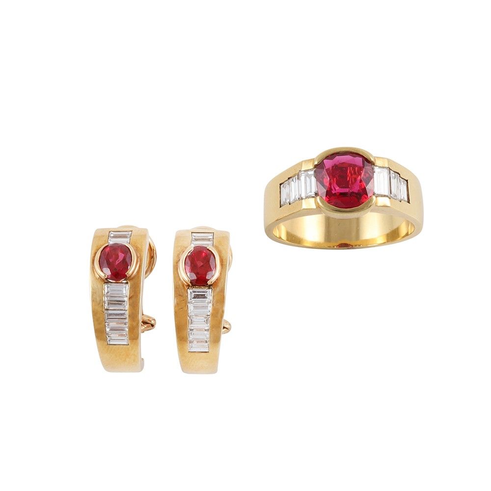 in oro giallo, composta da anello a fascia e orecchini a nastro, ornati da spinelli rossi e diamanti taglio baguette, gr. complessivi 19,3. Anello misura 22