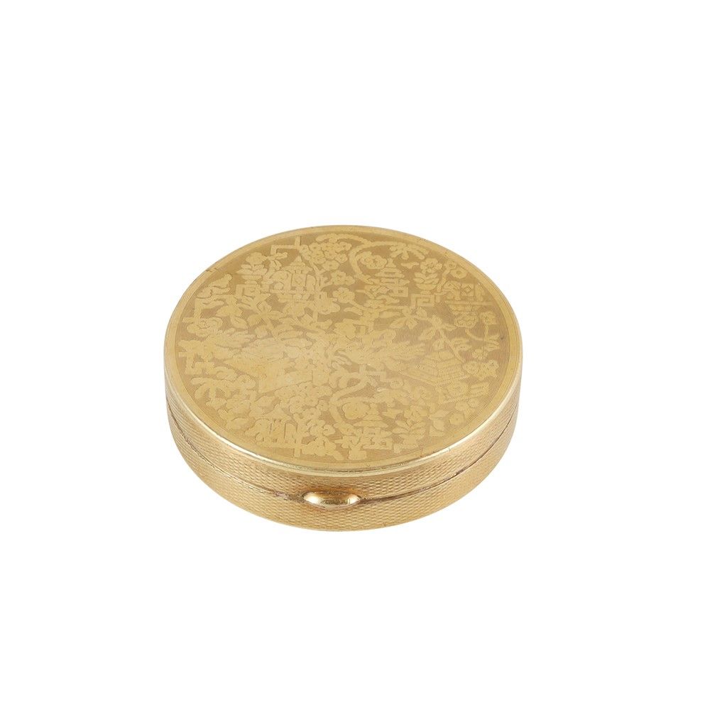 in oro giallo a corpo circolare, inciso con motivi d'ispirazione orientale, gr. netti 33. Dimensioni 5 x (h) 1,3 cm ca.