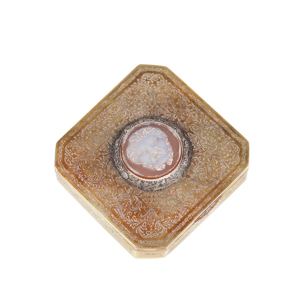 in oro giallo a forma ottagonale inciso con motivi vegetali, al centro un cammeo raffigurante un mascherone in agata entro cornice in argento, gr. 39,9. Dimensioni 4,8 x 4,8 (h) 1,5 cm ca.