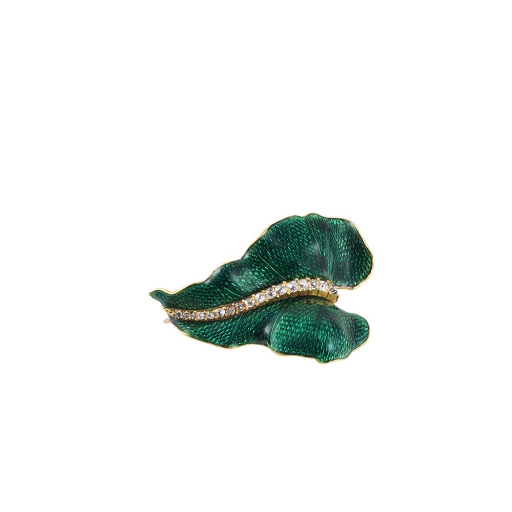 in oro giallo a foglia lanceolata in smalto verde guilloché, ornata da diamanti taglio antico europeo, gr. 6,2. Dimensione 3,2 x 2 cm ca.