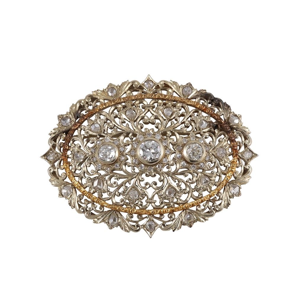a forma ovale traforata, realizzata in oro bianco e giallo, impreziosita da tre diamanti taglio antico europeo e diamanti taglio a rosa, gr. 18. Dimensioni 4,8 x 3,6 cm ca.