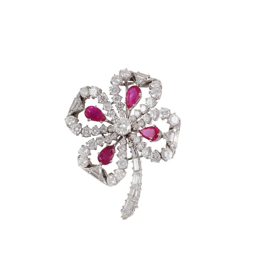 quadrifoglio in oro bianco, impreziosito diamanti taglio a brillante, baguette e triangolare del peso complessivo di 6 ct ca. e rubini a goccia del peso complessivo di 4 ct ca., gr. 15. Dimensioni 5 x 3,5 cm ca.