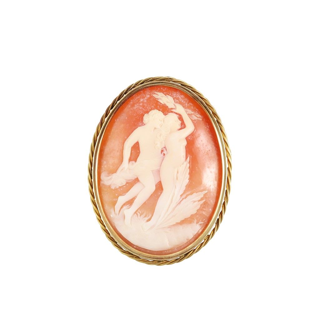 con cammeo di conchiglia raffigurante una scena classica, entro cornice in oro giallo, gr. 14. Dimensioni 5 x 3,7 cm ca.
