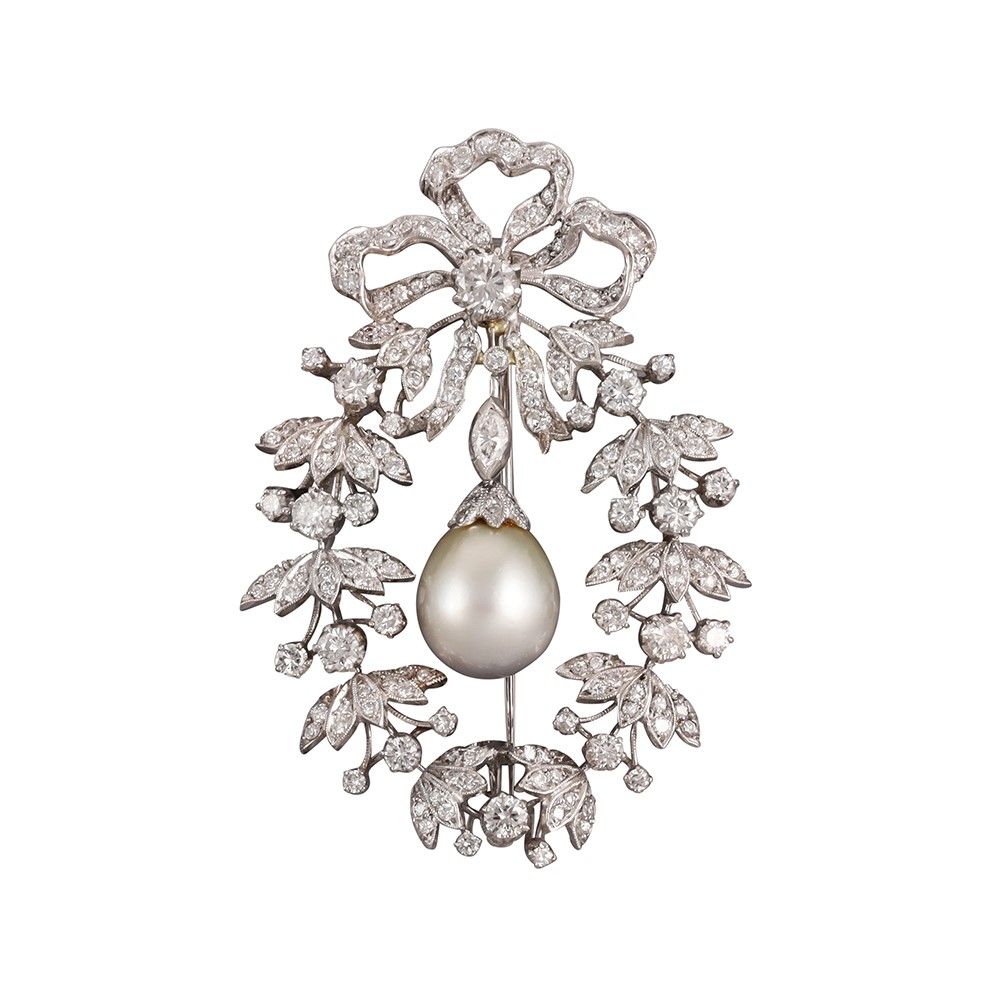 in platino, a ghirlanda sormontata da un motivo a fiocco, interamente ornata da brillanti, al centro della spilla è posta una perla coltivata pendente, gr. 22,5. Dimensioni 5,7 x 4 cm ca.