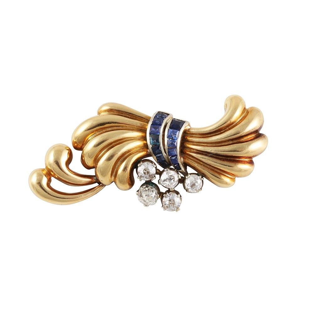 in oro giallo e bianco a fiocco stilizzato, ornata da diamanti taglio antico europeo e zaffiri carré, gr. 9,3. Dimensioni 5 x 2,5 cm ca.