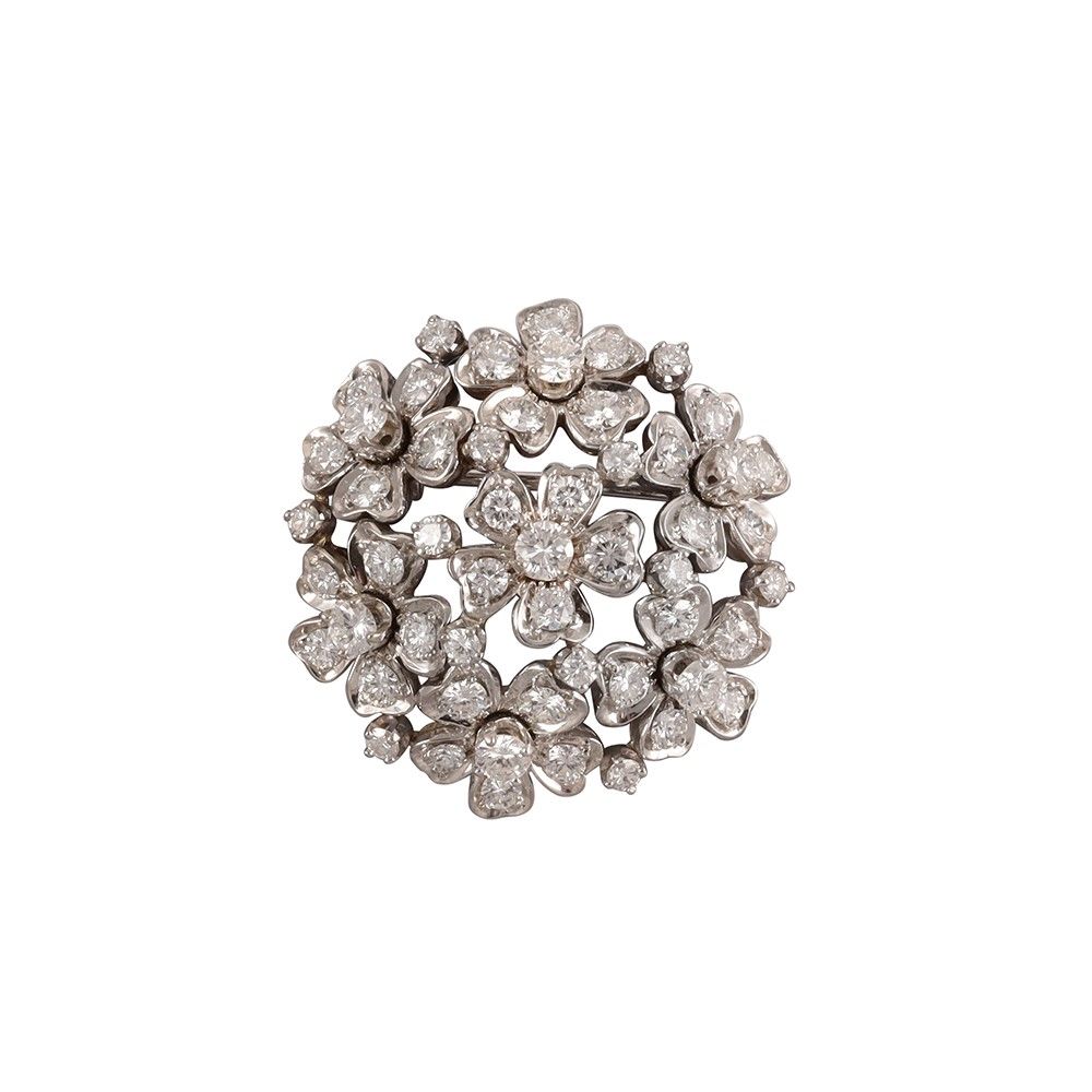 tonda formata da motivi floreali in brillanti del peso complessivo di 2,30 ct ca., gr. 9,7. Diametro 3 cm ca.