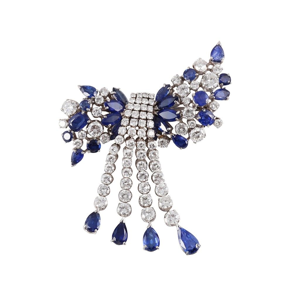 in platino ornata da brillanti del peso complessivo di 6 ct ca e zaffiri di tagli differenti, raffigurante un fiocco stilizzato con morbida frangia, gr. 31,2. Dimensioni 7 x 6 cm ca.