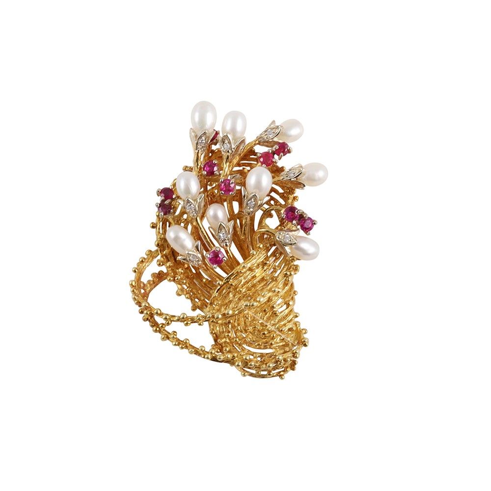 in oro giallo e bianco a guisa di cesto fiorito stilizzato, ornata da rubini, perle d'acqua dolce e piccoli diamanti, gr. 16,8. Dimensioni 4,5 x 3 cm ca.
