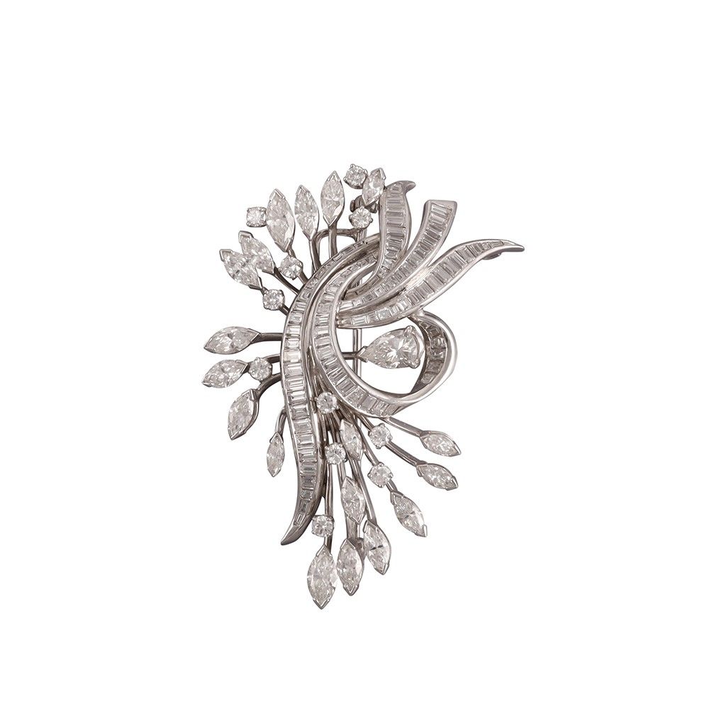 d'ispirazione vegetale, realizzata in platino, ornata da brillanti e diamanti taglio navette e baguette del peso complessivo di 5 ct ca., gr. 24,4. Dimensioni 5,7 x 4,2 cm ca.