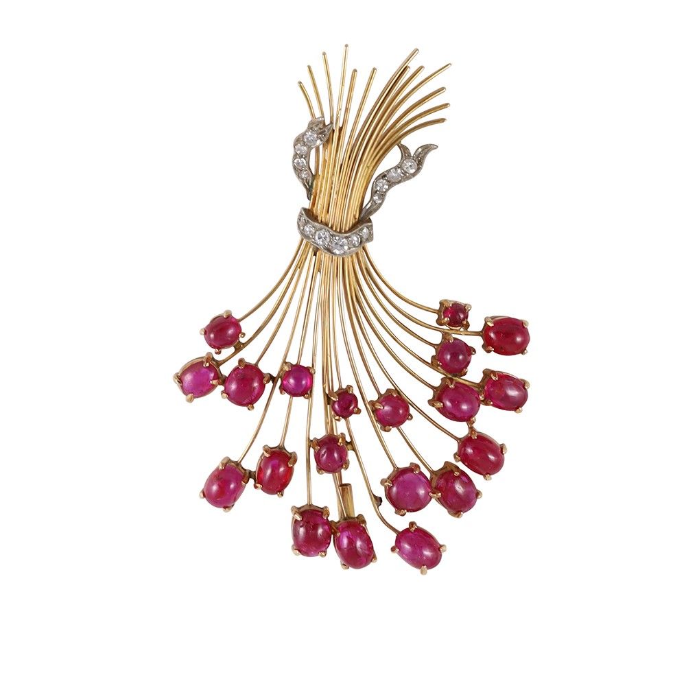 'bouquet' in oro giallo con rubini taglio cabochon, trattenuto da un motivo a nastro in platino ornato da diamanti, gr. 15,8. Corredata da custodia. Dimensioni 6 x 4,2 cm ca.