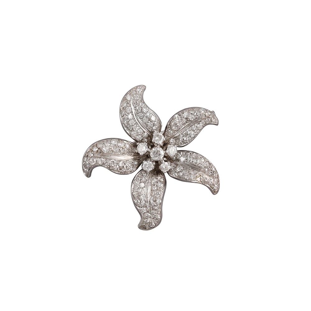 in oro bianco a forma di fiore, impreziosita da diamanti, gr. 8,8. Dimensioni 3,5 x 3,5 cm ca.