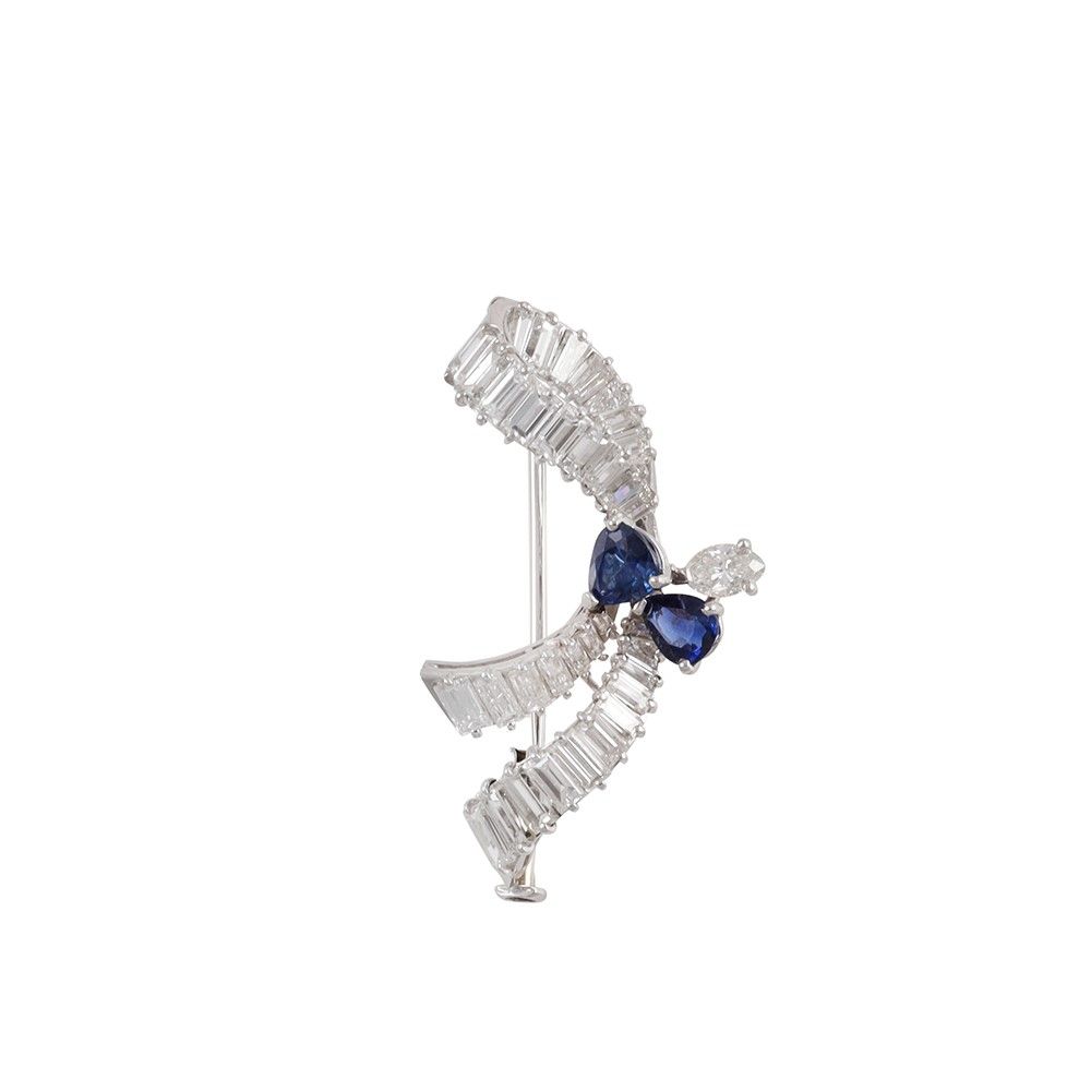 in platino a nastro impreziosita da diamanti taglio baguette, due zaffiri a goccia e un diamante navette, gr. 9,2. Dimensioni 4 x 2,5 cm ca. Numerario: 347 AL (Frascarolo Pierino & C. - Valenza)