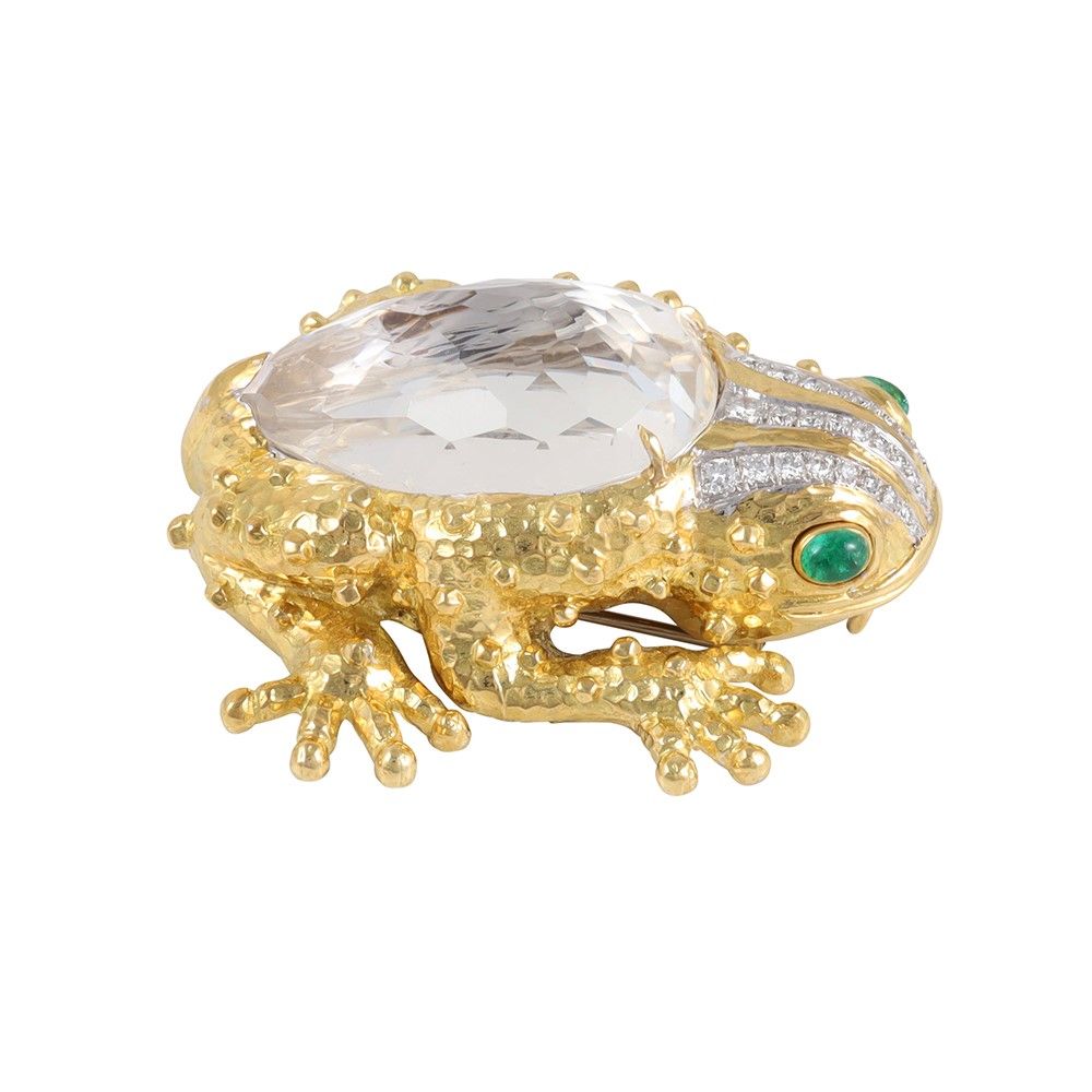 doppio uso, realizzata in oro giallo e platino, sormontata da un grande quarzo ialino sfaccettato. Due smeraldi taglio cabochon per occhi e brillanti ad ornamento, gr. 73,8. Corredata da custodia-pochette originale. Dimensioni 5,6 x 5,6 cm ca. Firmata: David Webb