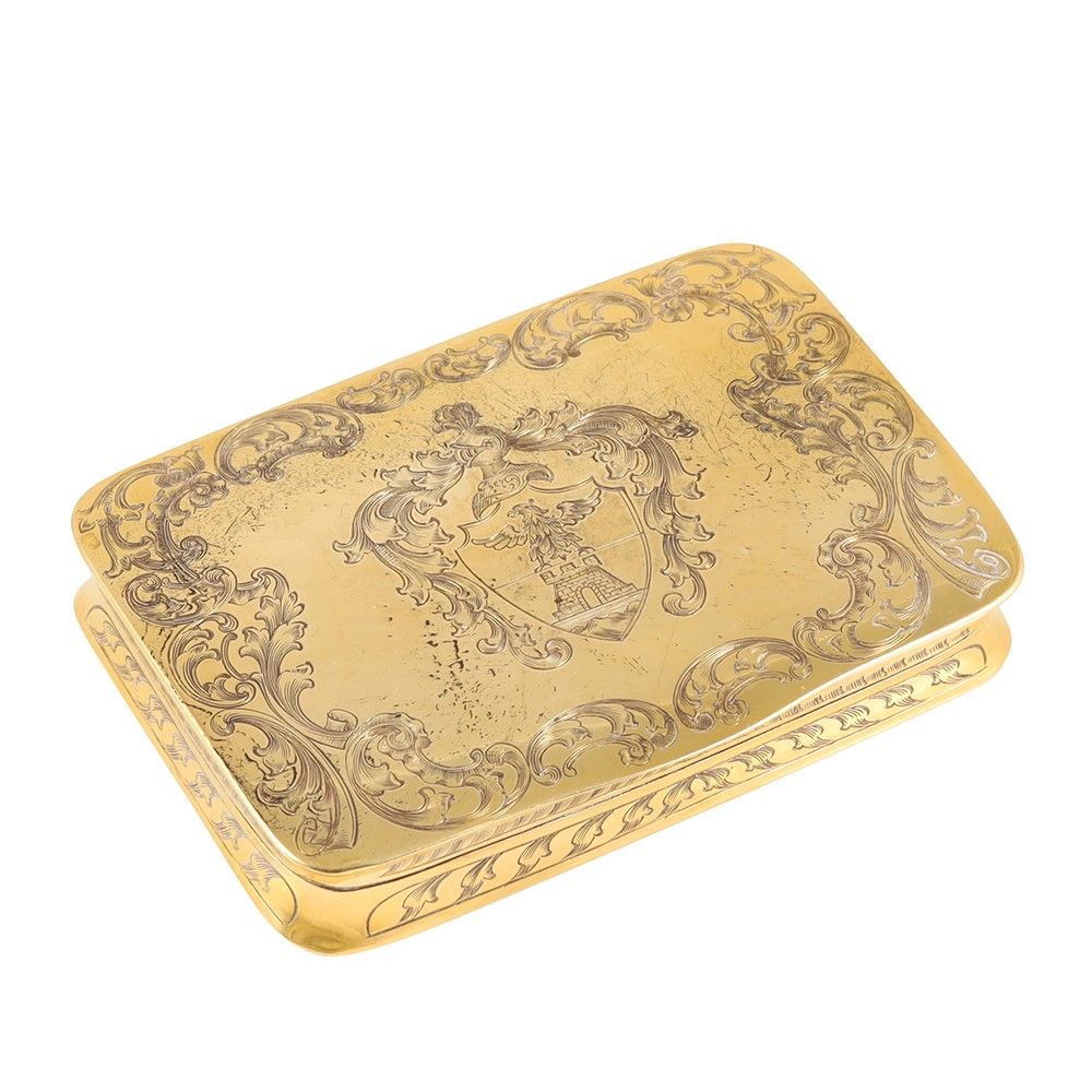 in oro giallo a corpo rettangolare incisa con motivi a volute e stemma araldico, gr. 120,2. Dimensioni 8 x 6 h 1,3 cm ca.