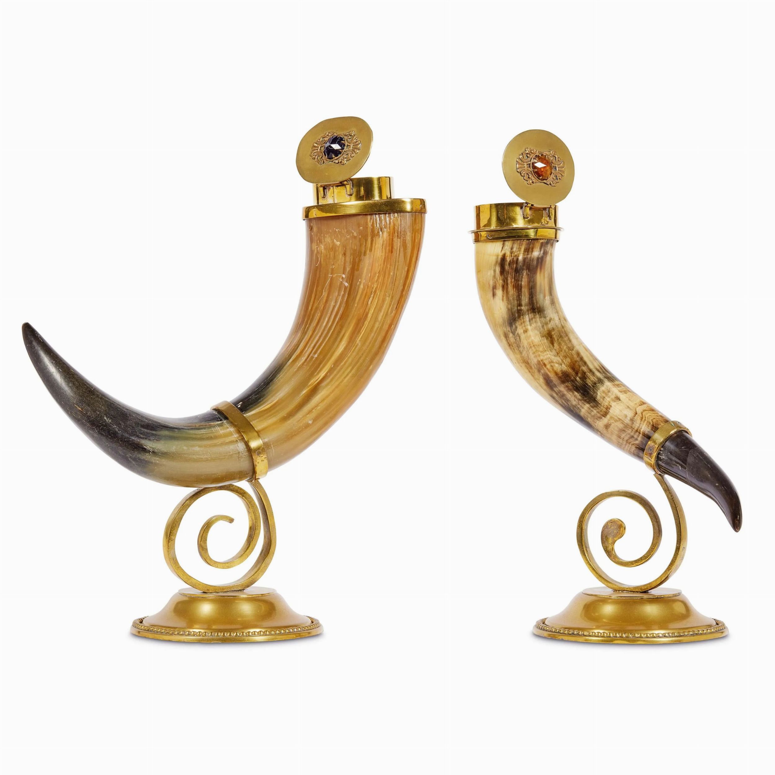 in corno, con applicazioni, sostegni e montatura a scatola in bronzo dorato, cm 41,5x37x17 e cm 39x27x17