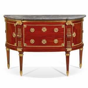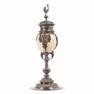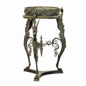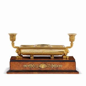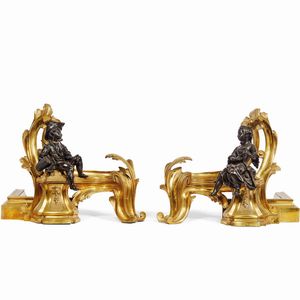 COPPIA DI ALARI, FRANCIA, SECOLO XIX in bronzo dorato, di forma a balaustra con grande vaso sormonatato da fiamme [..]