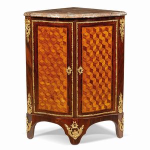 ANGOLIERA, FRANCIA, SECOLO XVIII lastronata in legni vari, con applicazioni in bronzo dorato e piano in marmo, [..]