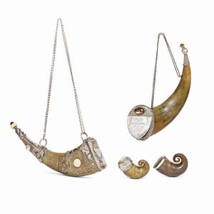 ASSORTIMENTO DI CORNUCOPIE, SECOLO XX in corno, composto da una con intagli e incisioni e terminale a forma [..]
