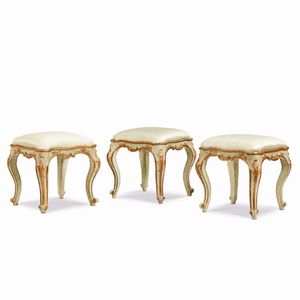 TRE SGABELLI, TORINO, LUIGI XV in legno laccato d'azzurro e parzialmente dorato, di linea mossa con profilature [..]