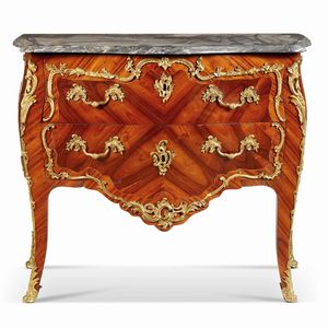 COMMODE, FRANCIA, SECOLO XVIII lastronato in legni scuri, con piano in marmo, fronte e fianchi di linea mossa; [..]