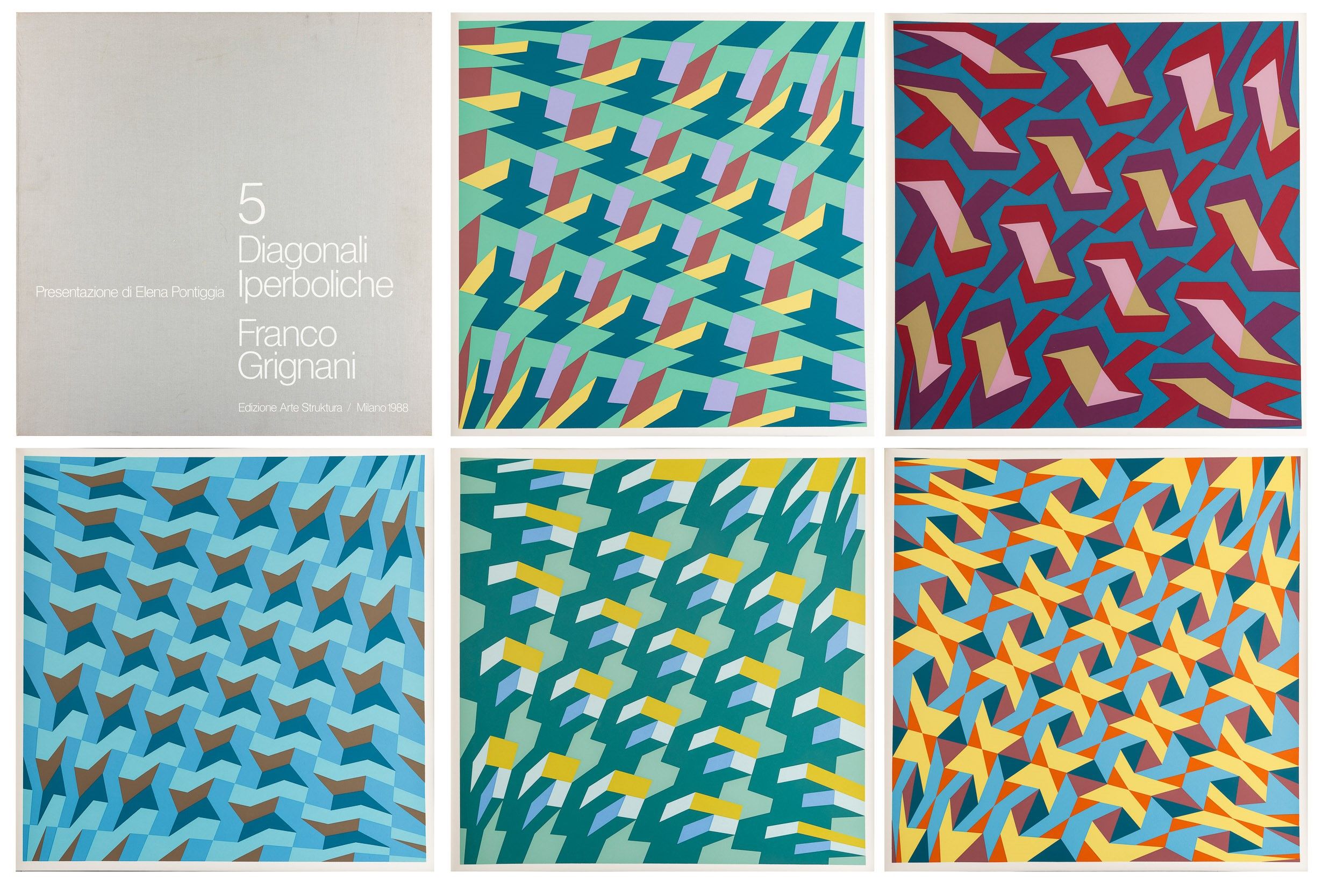 serigrafia, Largh. 50 - Alt. 50 cm 1988 ess. 9/100 su una tiratura di 100 esemplari in numeri arabi, 30 esemplari in numeri romani e 20 prove d'artista, Edizioni Arte Struktura, Milano Cartella contenente 5 serigrafie originali con testo introduttivo di E. Pontiggia Edizione firmata e numerata a matita nel colophon Ciascuna serigrafia è datata, firmata e numerata a matita al retro