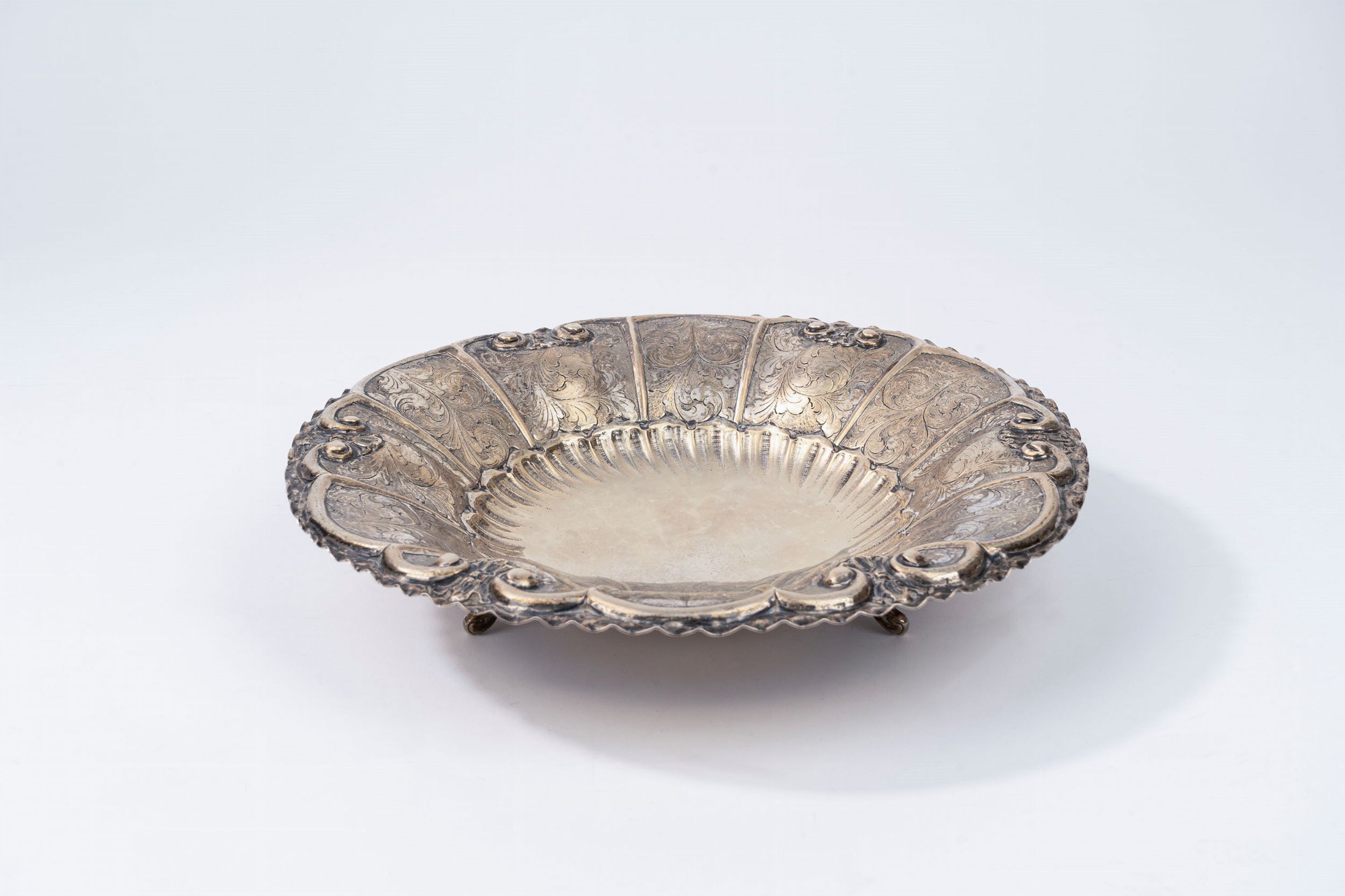 Italia, XX secolo di forma circolare, poggiante su tre piedini, interamente decorato con motivi fogliacei e a volute.