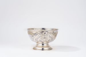 in argento, Peso g 553,00 h cm 15,00 Italia, secolo XX martellato, con motivi a volute e manico.