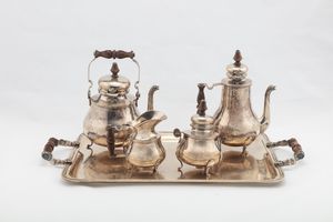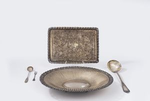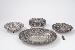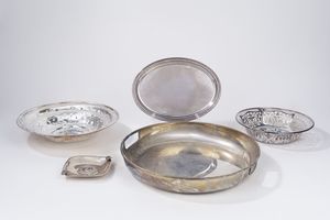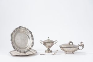 in argento, Peso kg 2,688 d max cm 34,80 Italia, secolo XX composto da due sottopiatti, cinque piattini pane e [..]