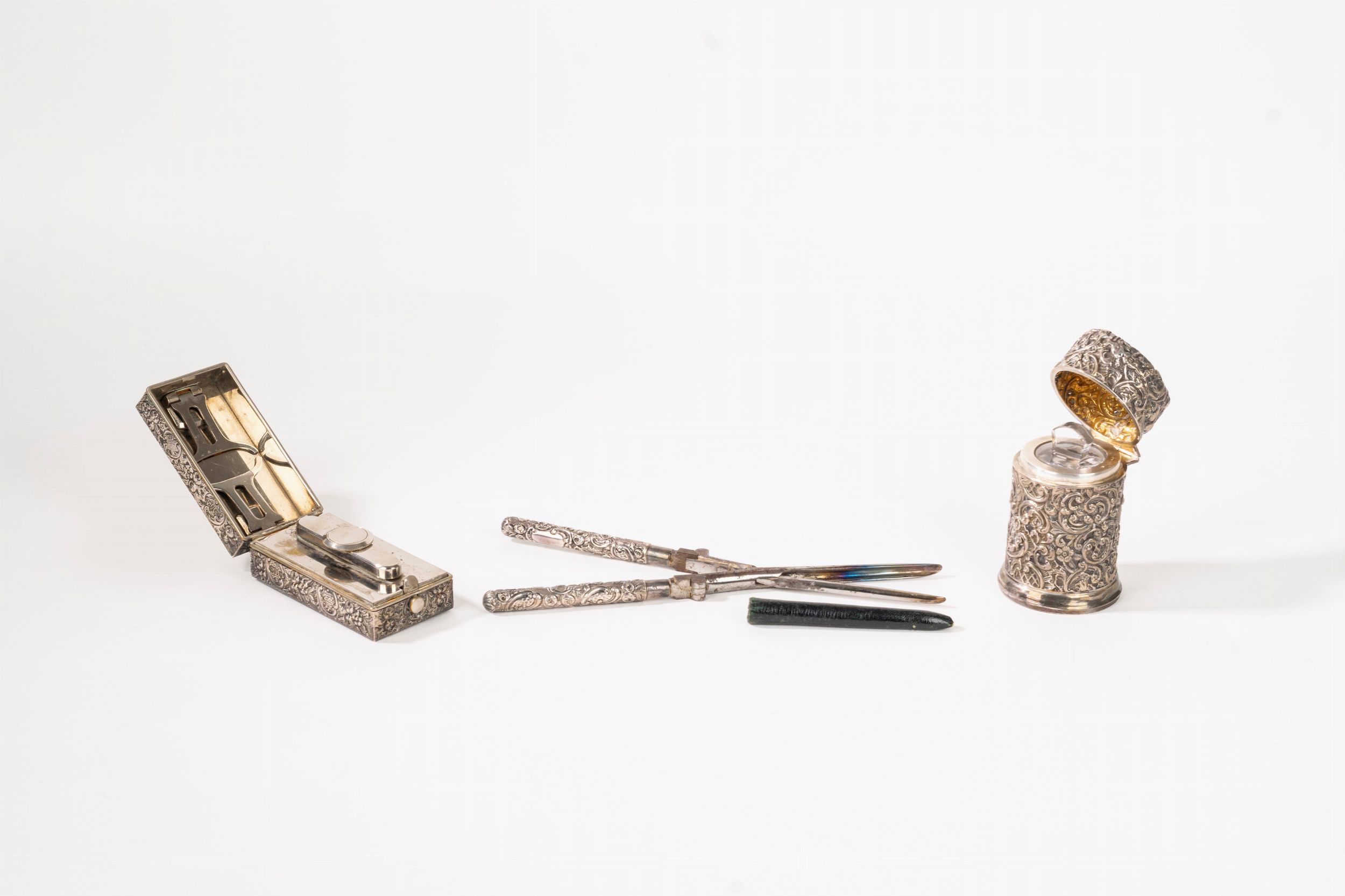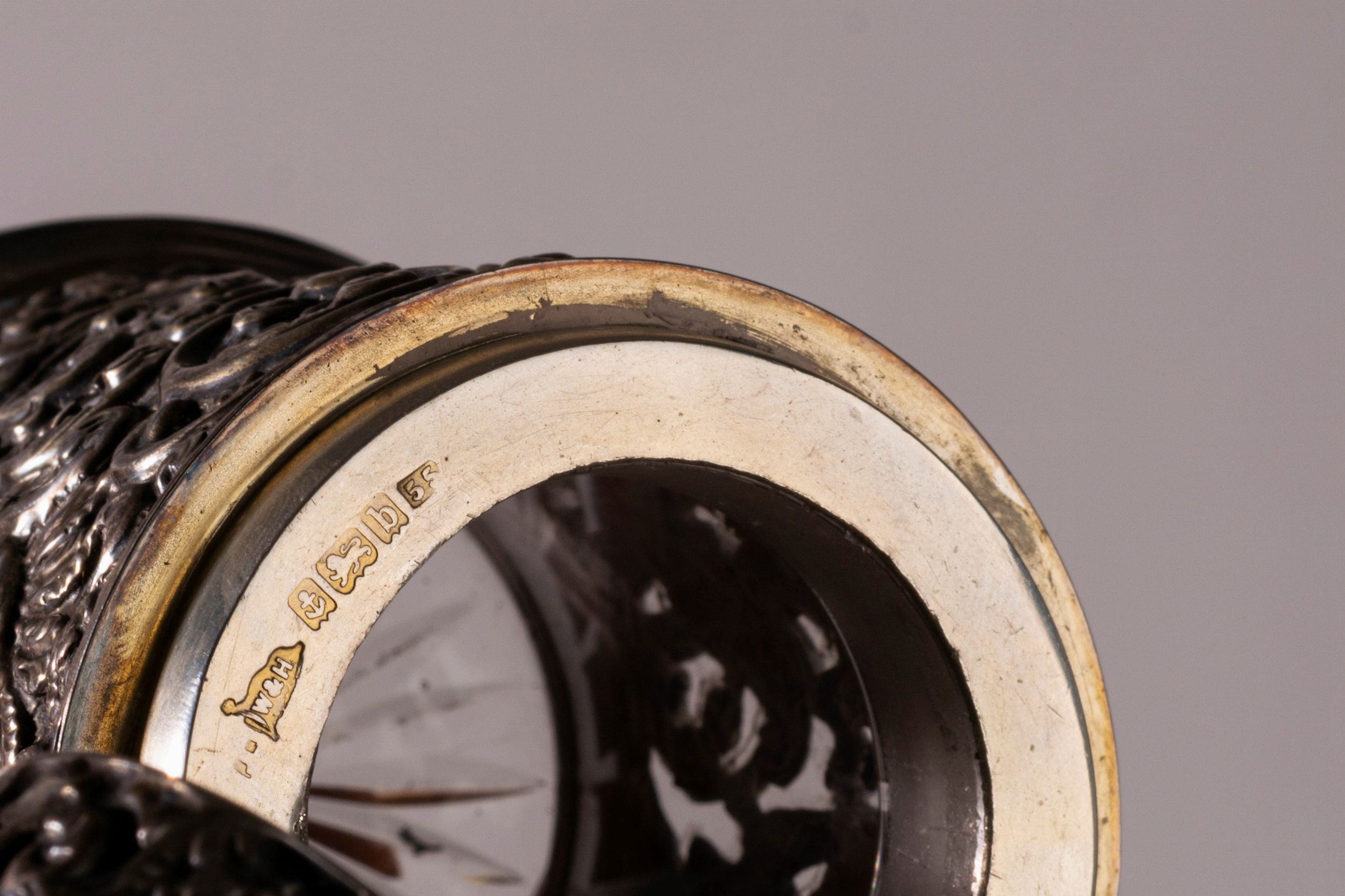 Inghilterra, secolo XX interamente cesellati e sbalzati con decori a rilievo, il portaprofumo punzonato Birmingham 1901 Walker and Hall, la stoppiniera Londra, Mappin and Webb.