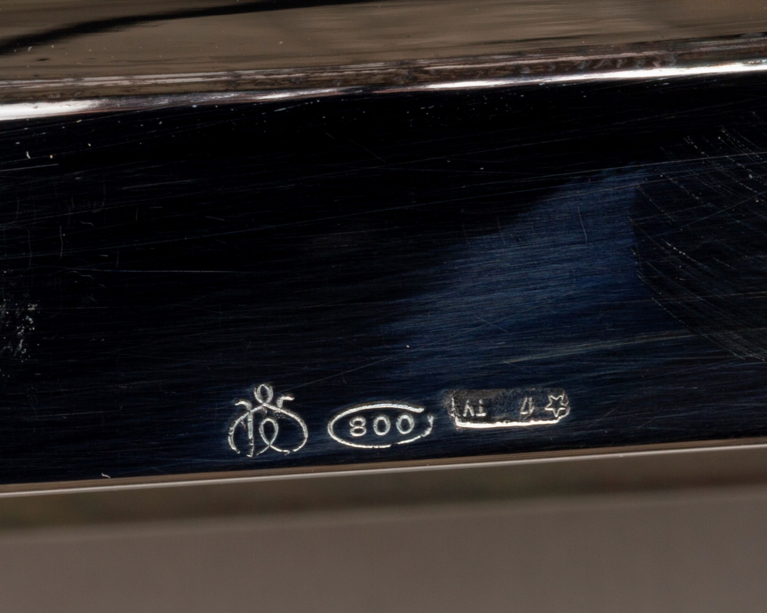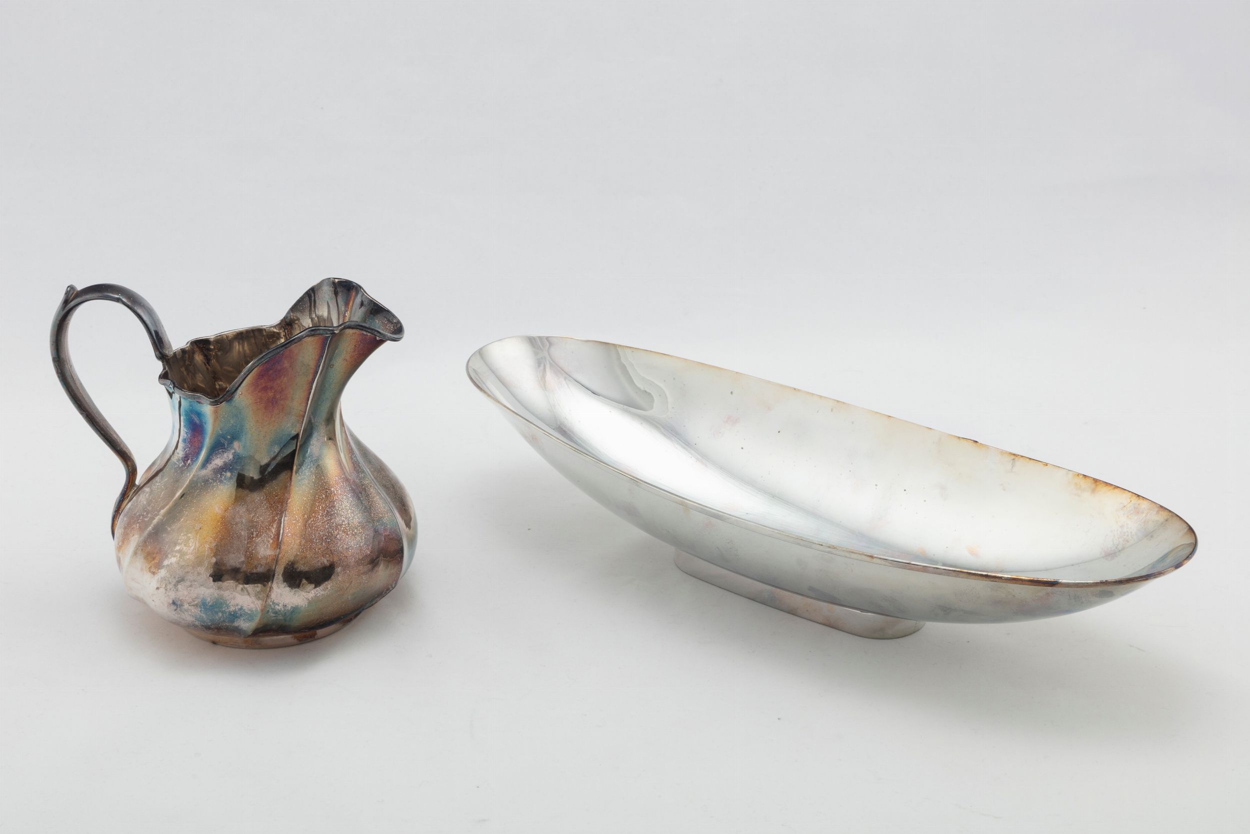 Italia, secolo XX la brocca bacellata e martellata con corpo a torchon, presa laterale mossa (h cm 15,50) ; il centrotavola di forma ovale a corpo liscio (l cm 38,50 x h 6,50).