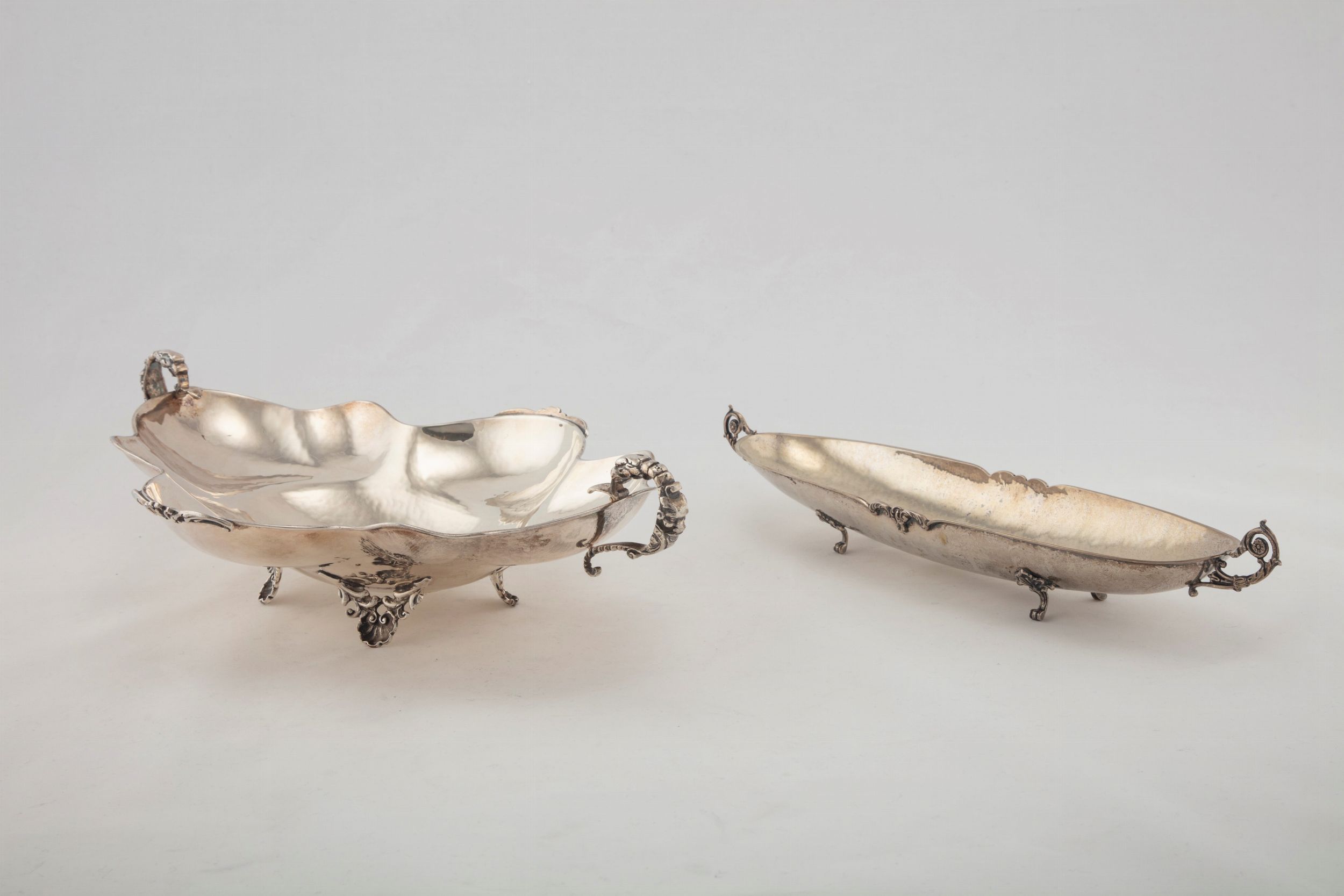 in argento, Peso kg 1,138 Italia, secolo XX il portagrissini di forma ovale, poggiante su piedi ferini e anse a volute ( l cm 42,00); il centrotavola di forma polilobata, con quattro piedini terminanti in valva di conchiglia e due anse con mascheroni (l cm 49,00).