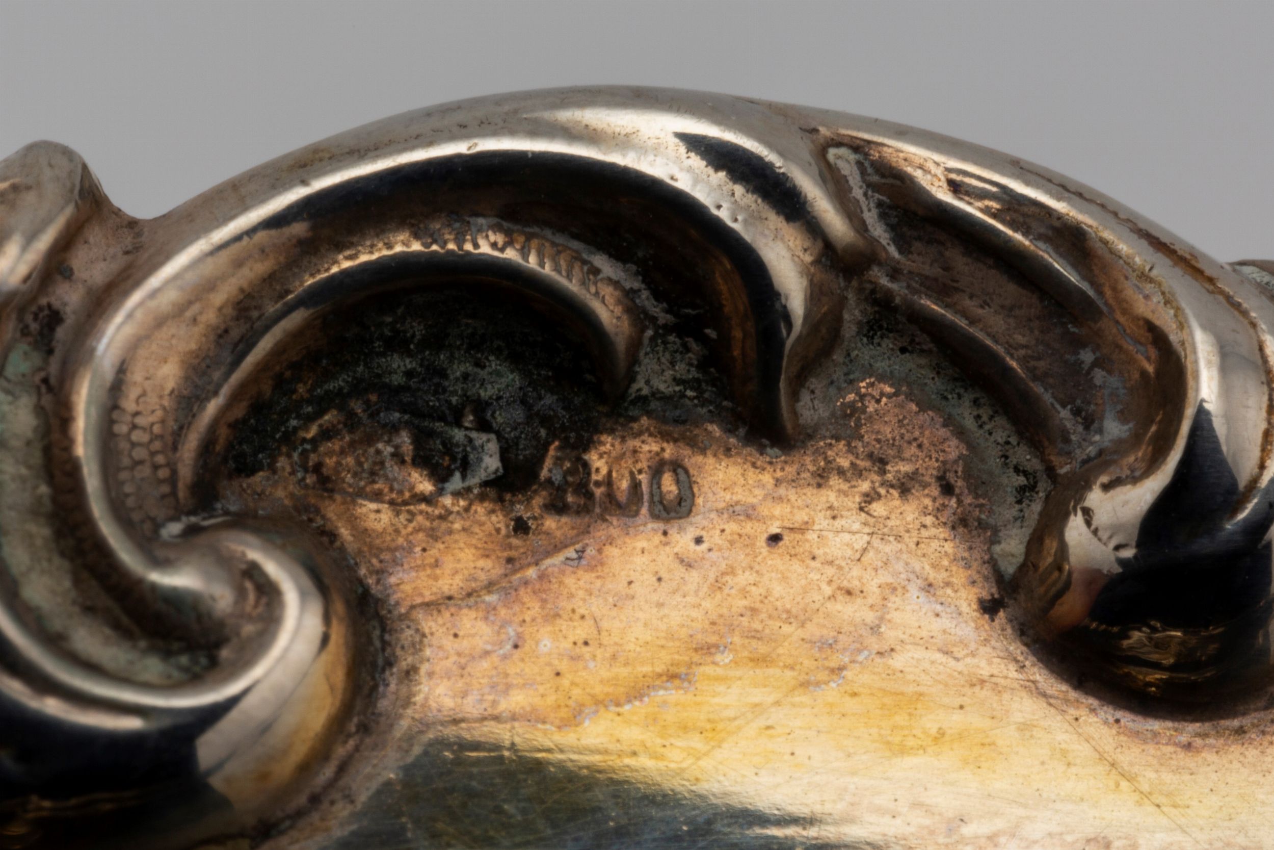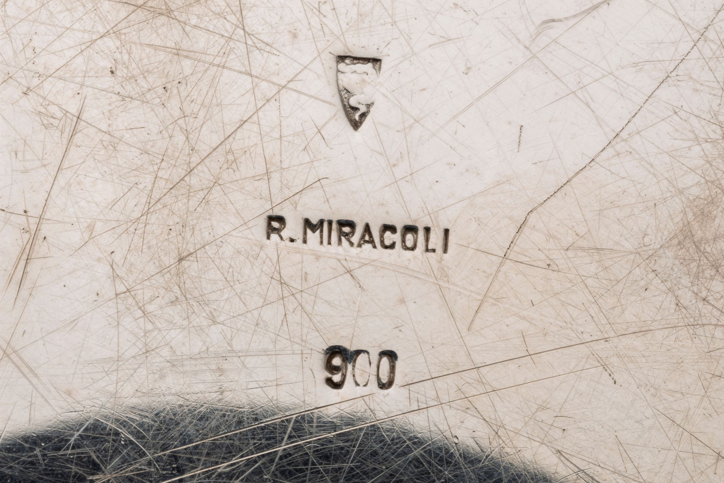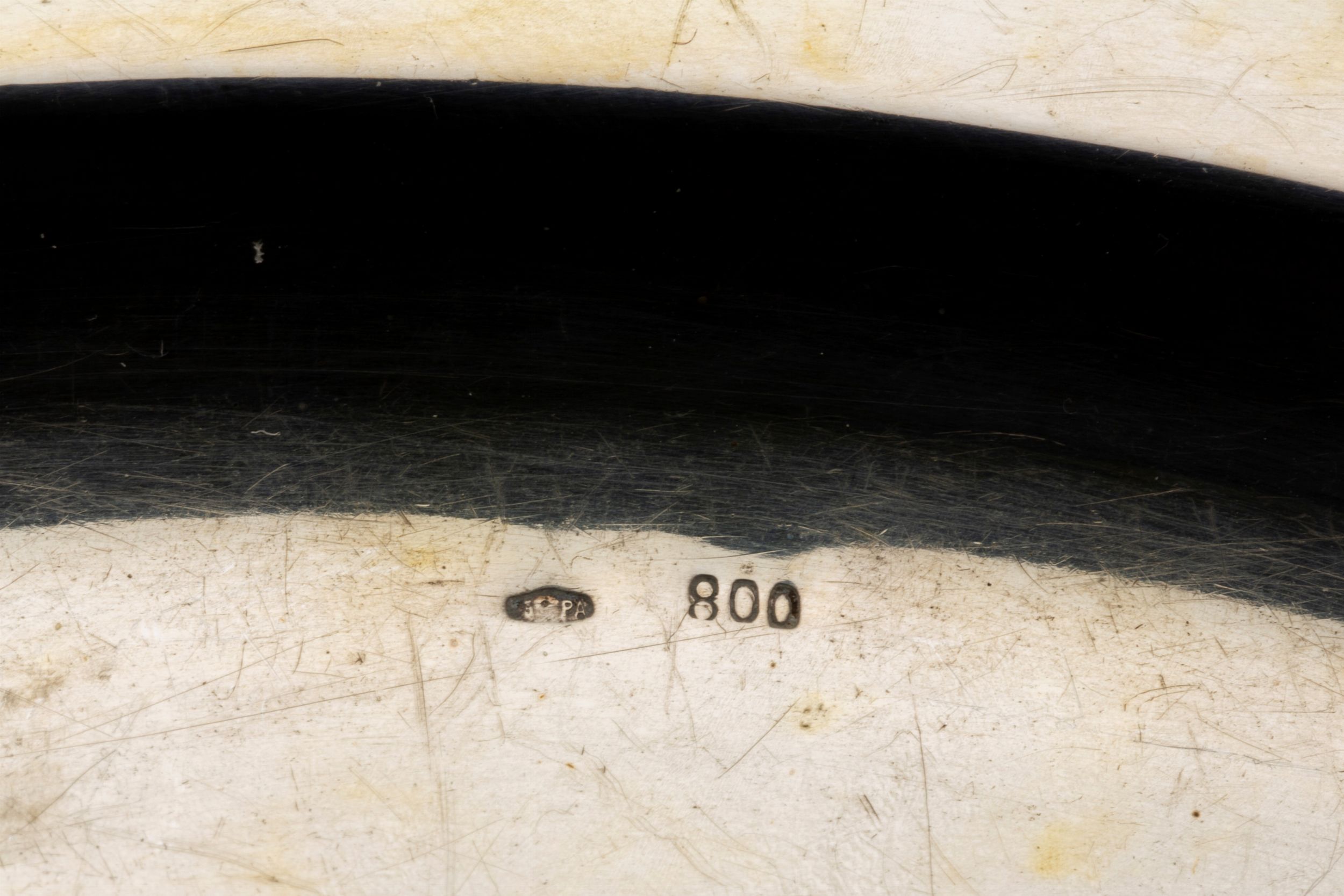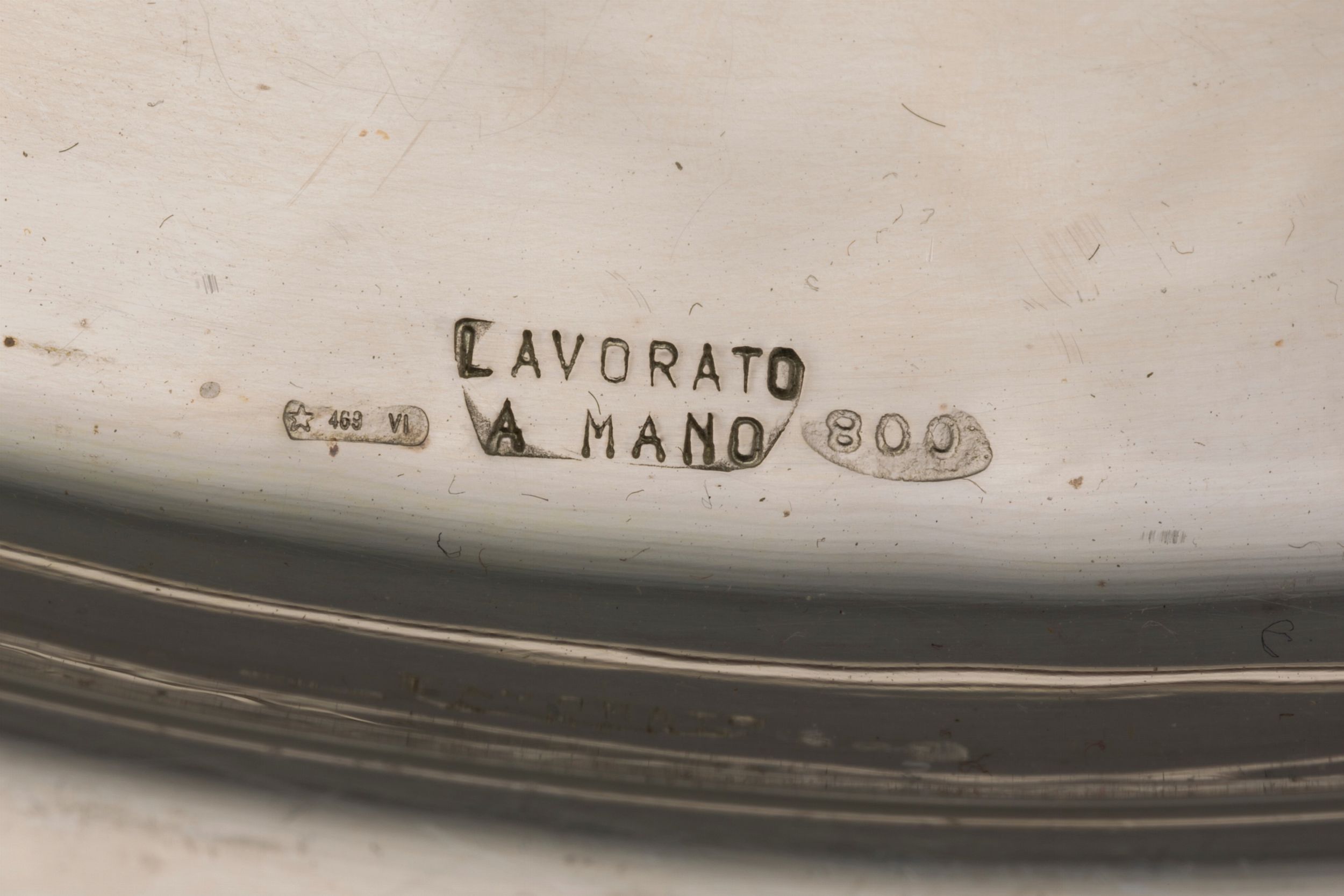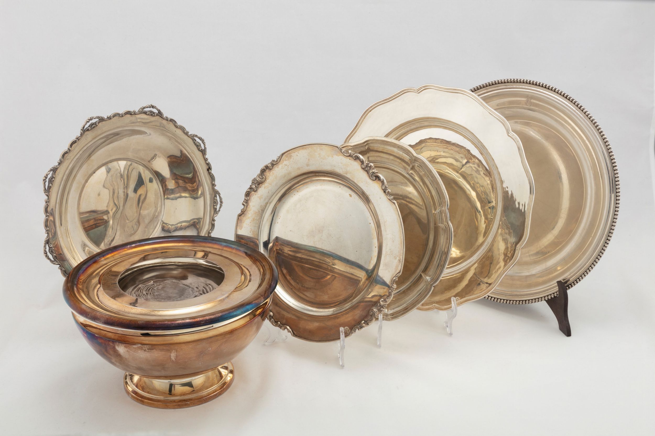 Italia, secolo XX una coppa porta caviale fusa e sagomata (h cm 13,00 x d cm 25,00), due piatti con bordo a rilievo, due piatti con bordo mistilineo e un piatto con bordo a perline (Miracoli Milano) (d cm 30,60).