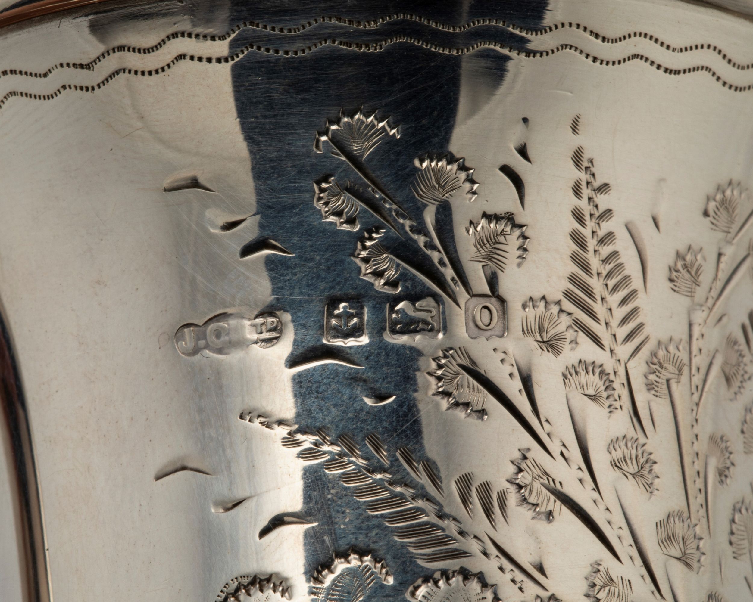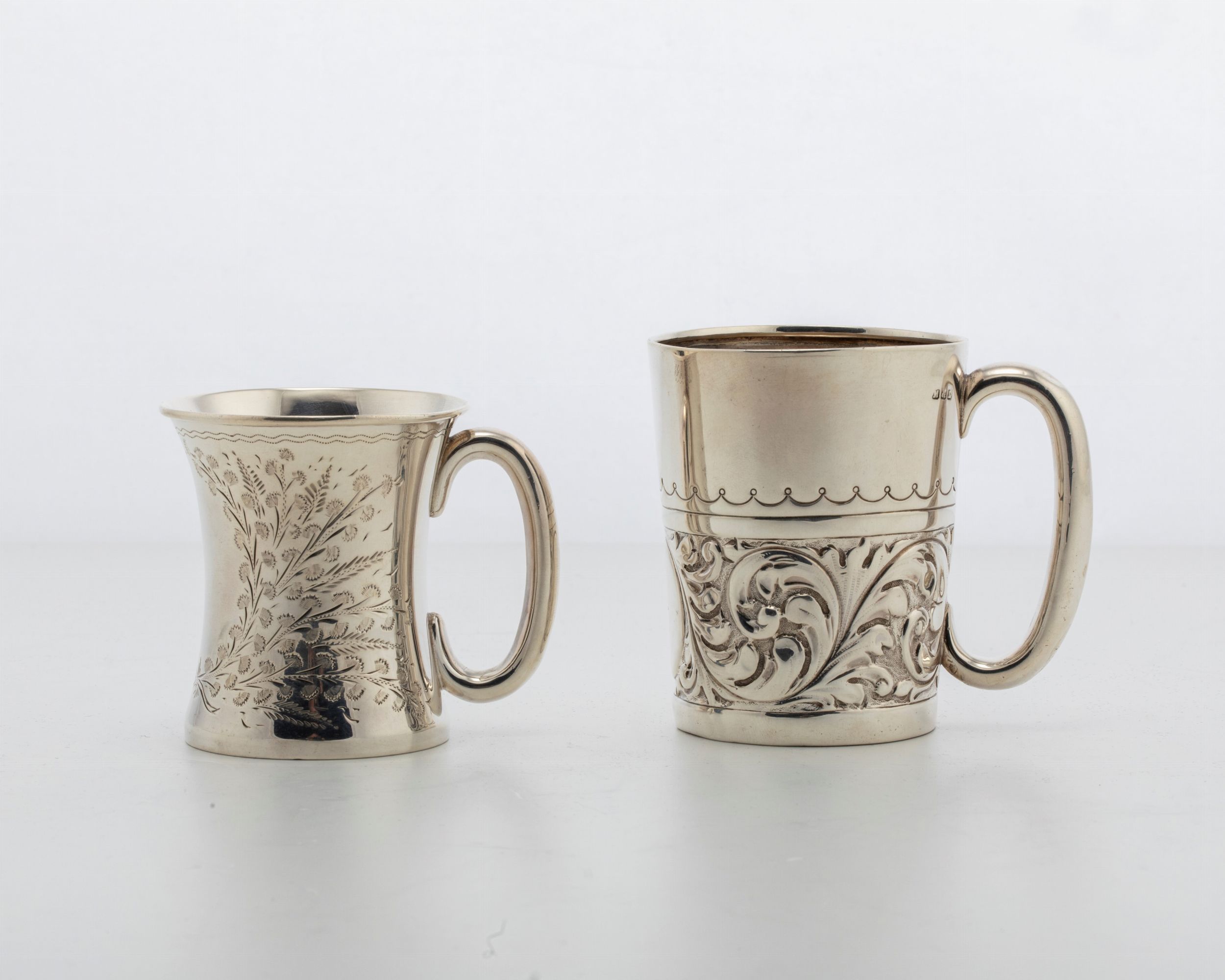 in argento 925, Peso g 172,00 h max cm 8,00 Birmingham, secolo XIX/XX il più piccolo con punzoni dell'argentiere JCLTD (non identificato), Birmingham 1913, inciso sul corpo con spighe di grano e fiori; l'altro con punzoni dell'argentiere M&L (non identificato), Birmingham 1887 con il corpo inciso e sbalzato con motivi fogliacei.