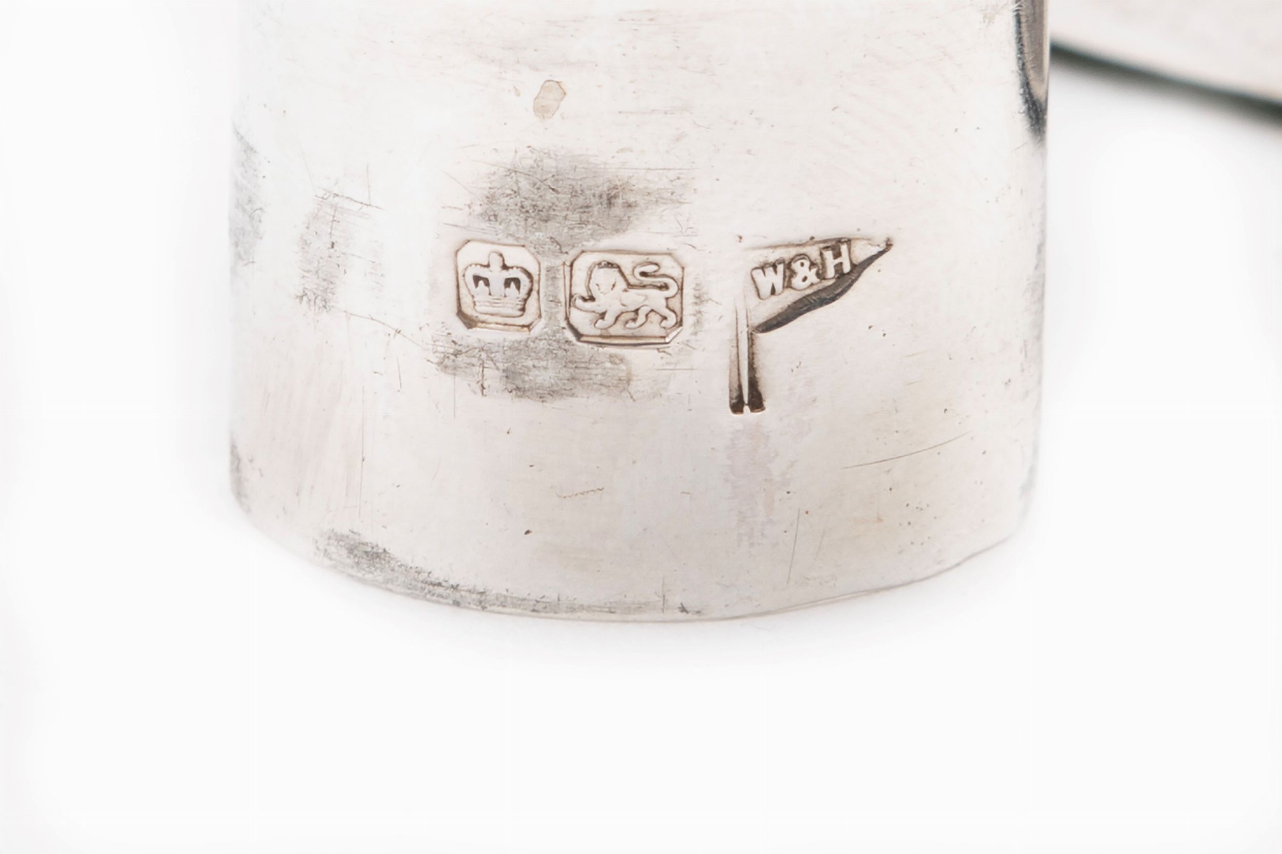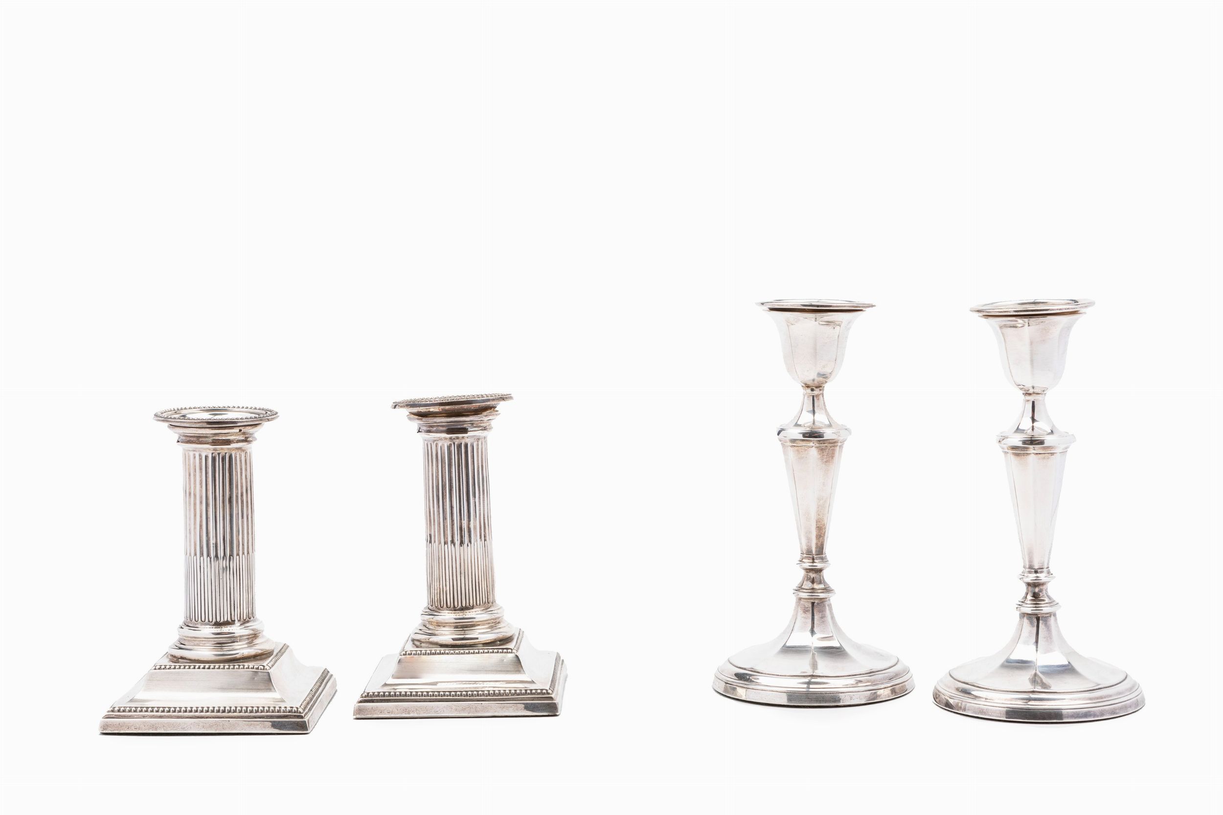 Città di Sheffield, inizi XX secolo argentieri W&H (Walker and Hall) e HE Ld (Hawksworth, Eyre Co. Ltd.), una coppia a capitello (h cm 12,50), su base quadrata, con decoro a perlinature; una coppia (h cm 16,50) su base circolare con decoro a nervature, bobeches estraibili punzonate.