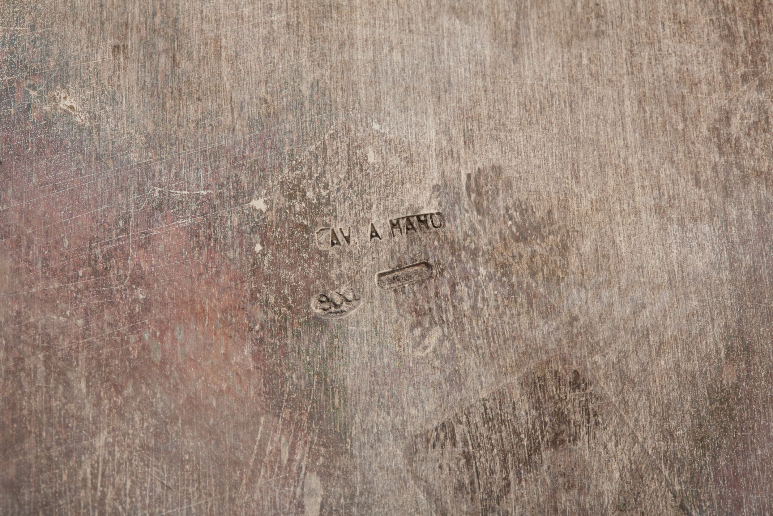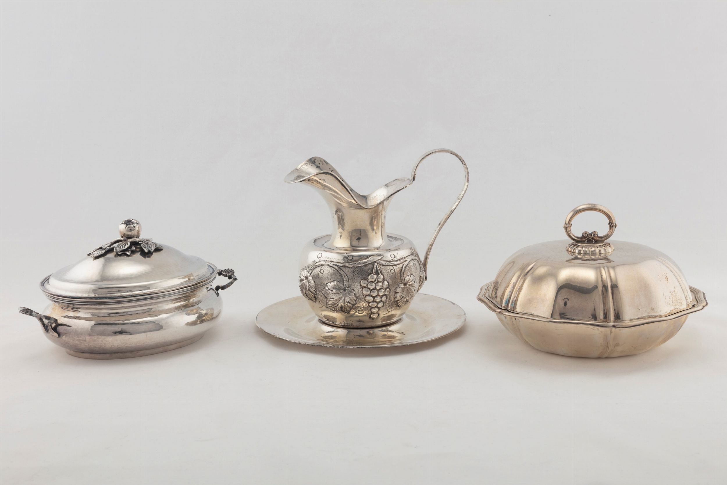 Italia, secolo XX la caraffa con corpo sbalzato a viticci e uva (h cm 21,00 e diametro piatto 25,50); una legumiera biansata con coperchio sbalzato a foggia di frutta (l cm 30,00x16,00); una legumiera di forma polilobata con bordo baccellato (h cm 15,00 x l 28,00).