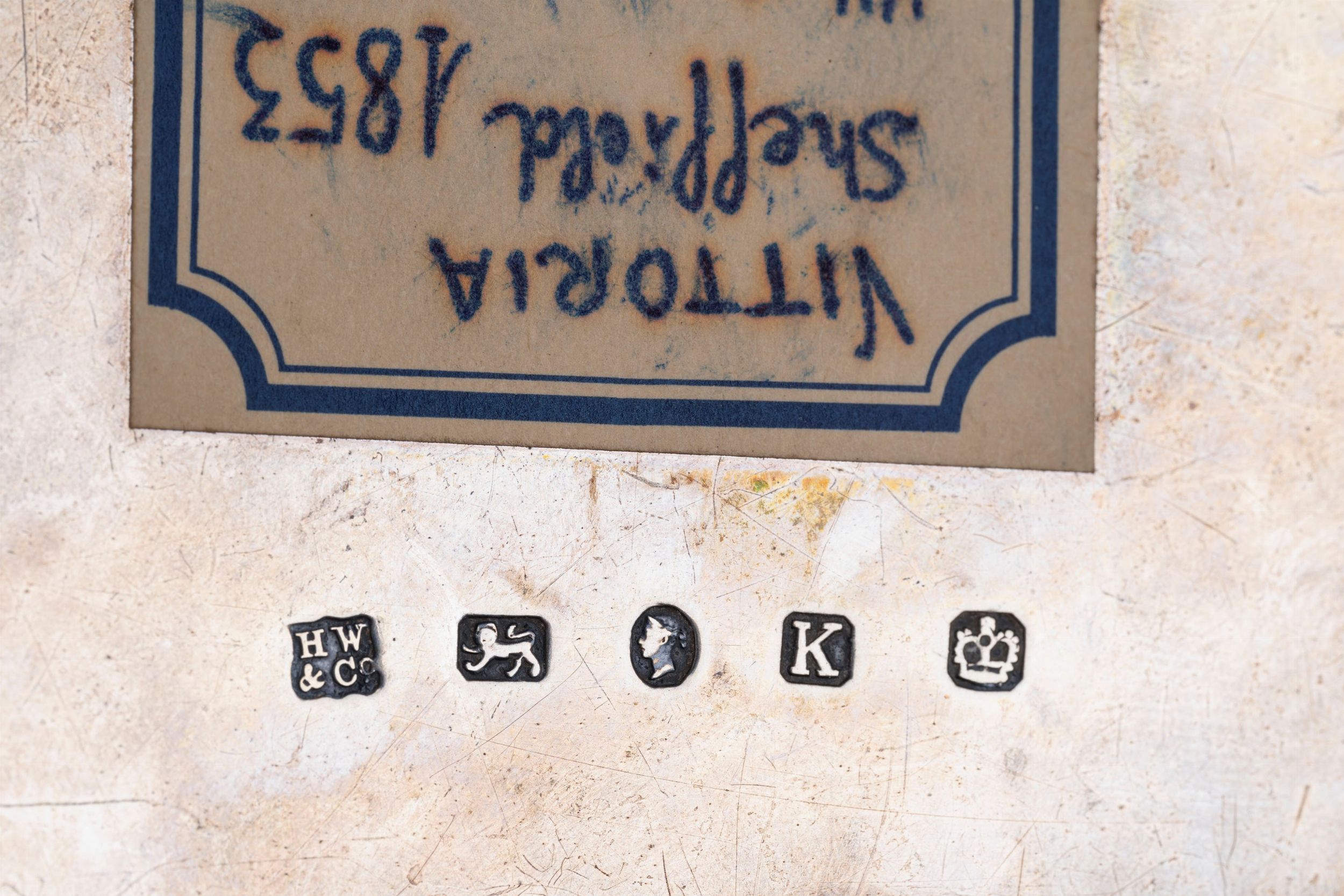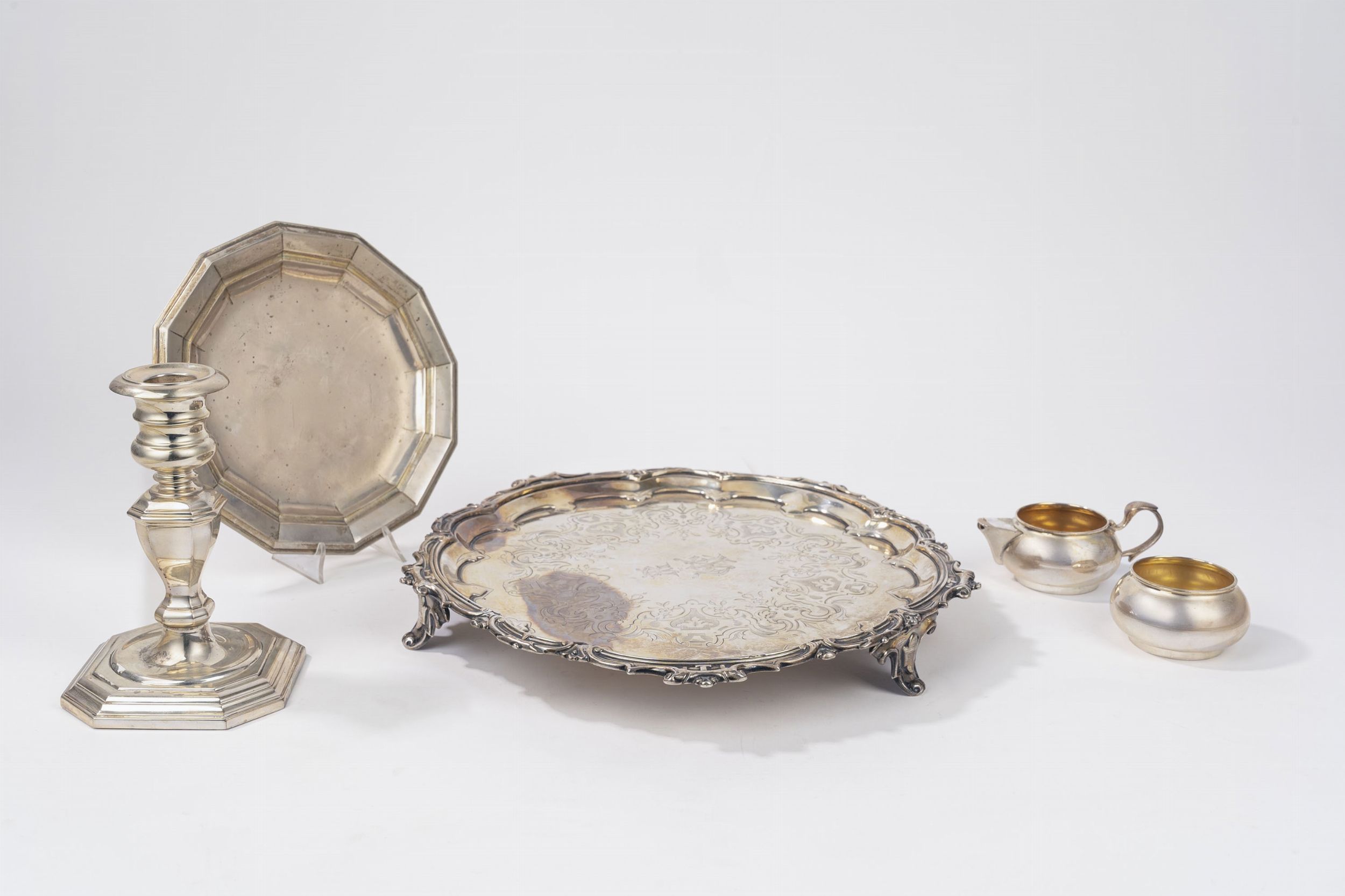 Italia e Inghilterra, secolo XIX/XX composto da un salver, città di Sheffield 1853, argentiere HY.WILKINSON & Co., un piattino, due salsiere e un candeliere (con base appesantita).