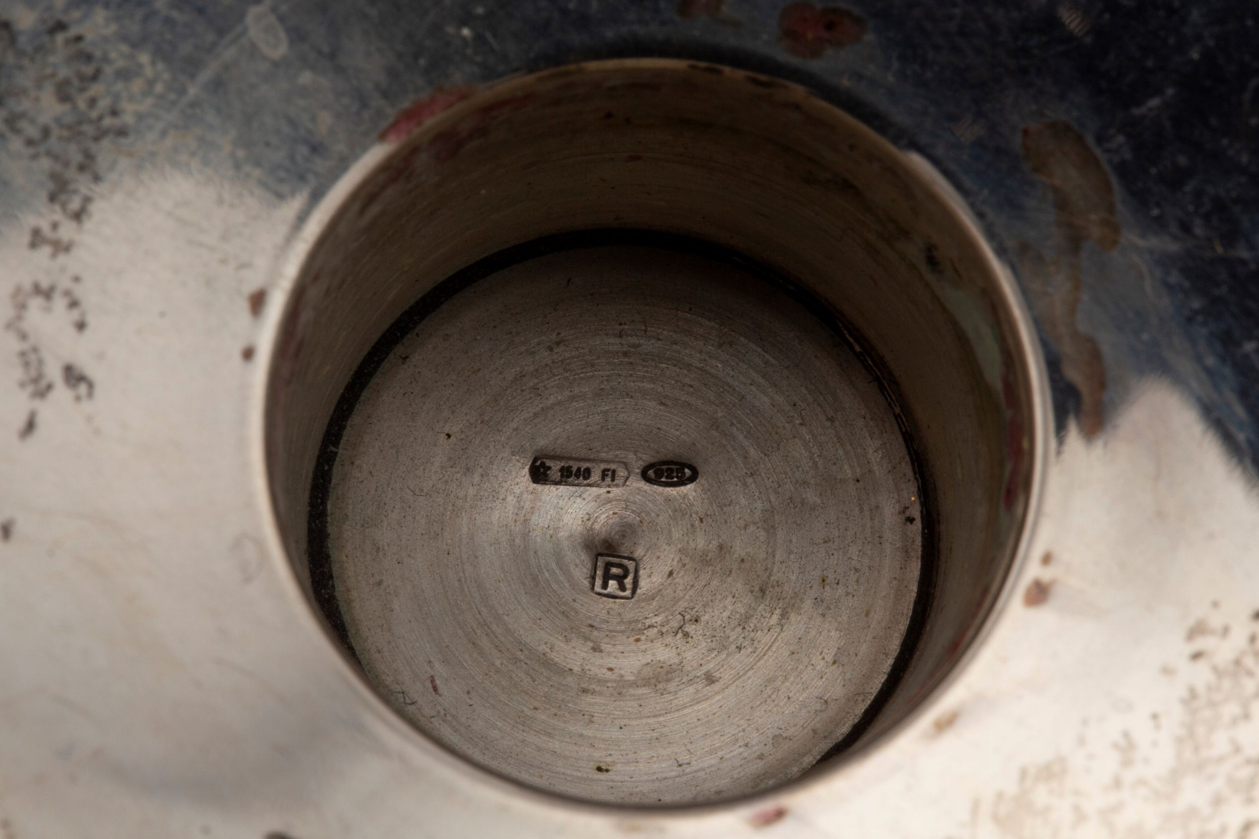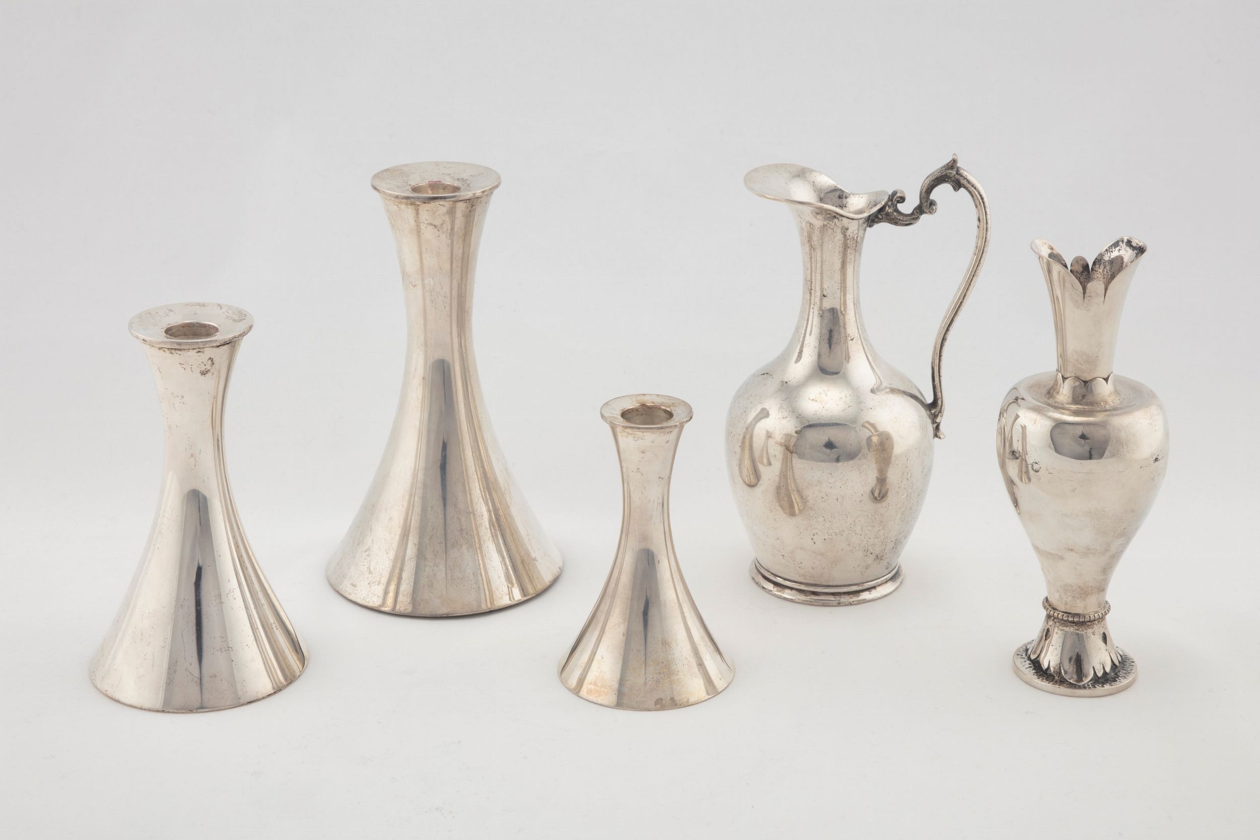 Italia, secolo XX composto da una brocca, un vaso con bocca a fiore (difetti), e tre candelieri rivestiti in argento 925.