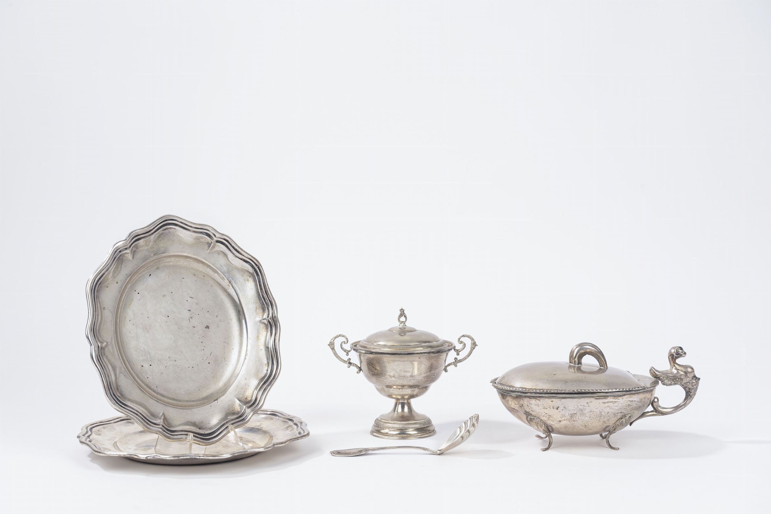 Italia, secolo XX composto da formaggiera con cucchiaio, zuccheriera e due piatti con bordo mosso.