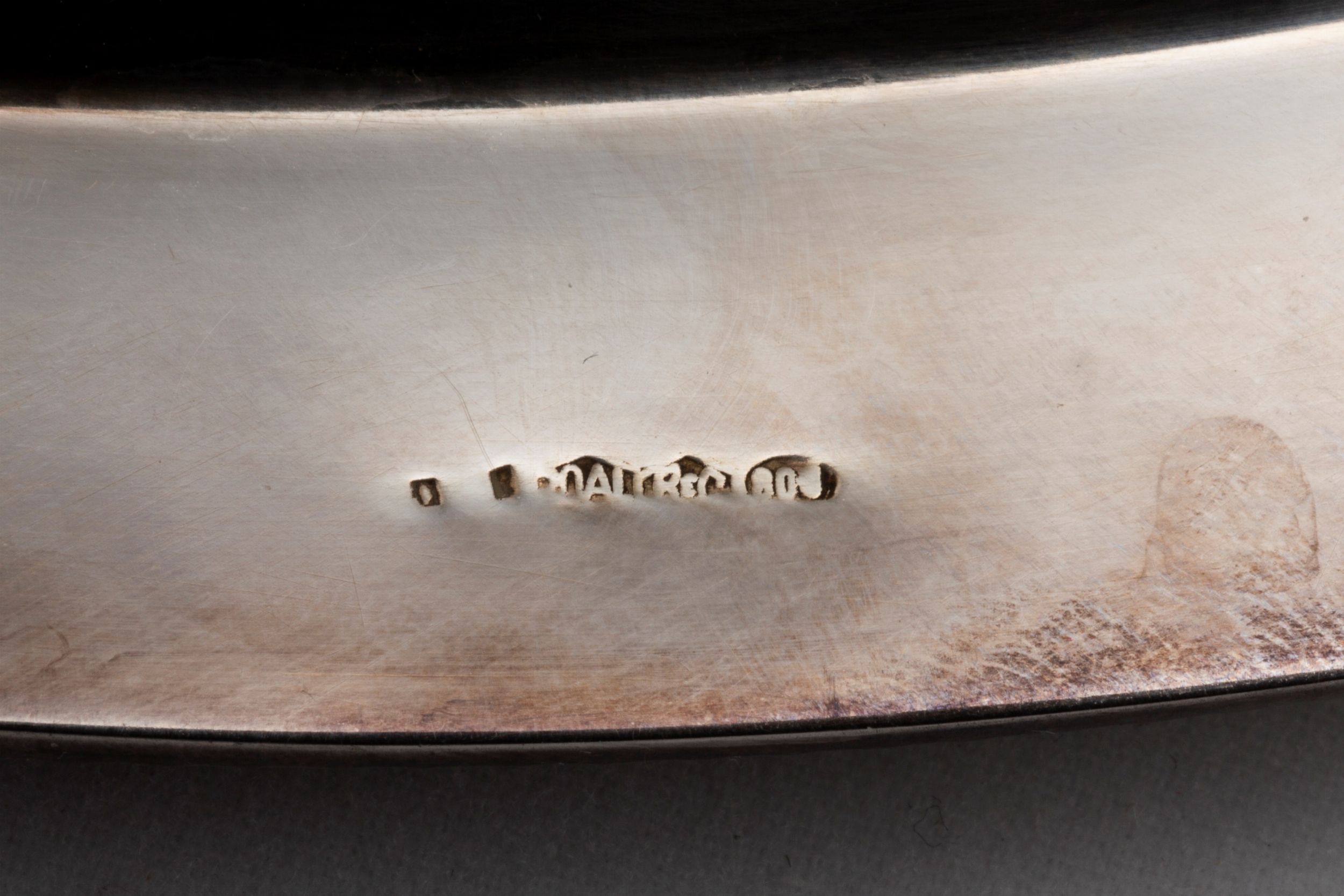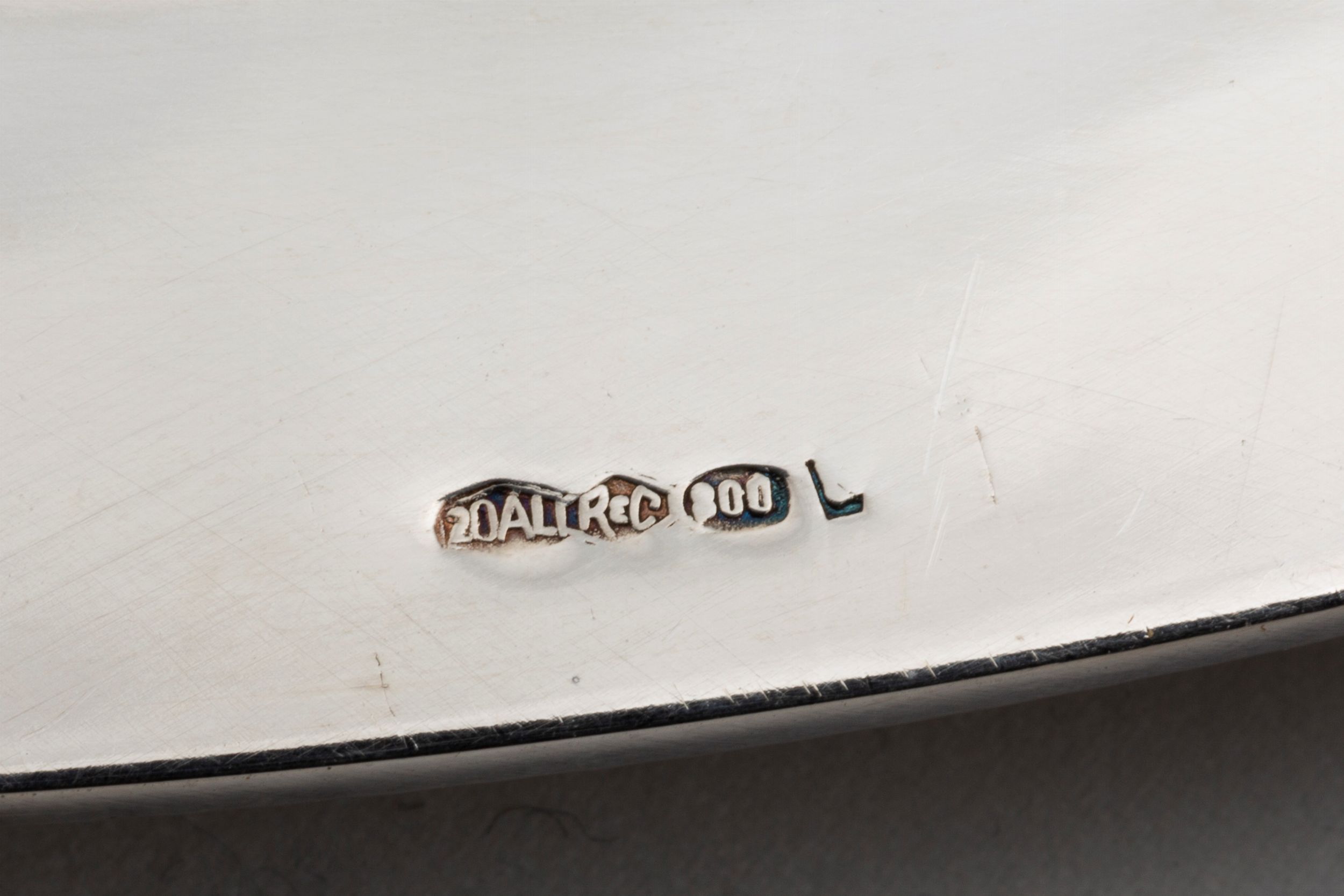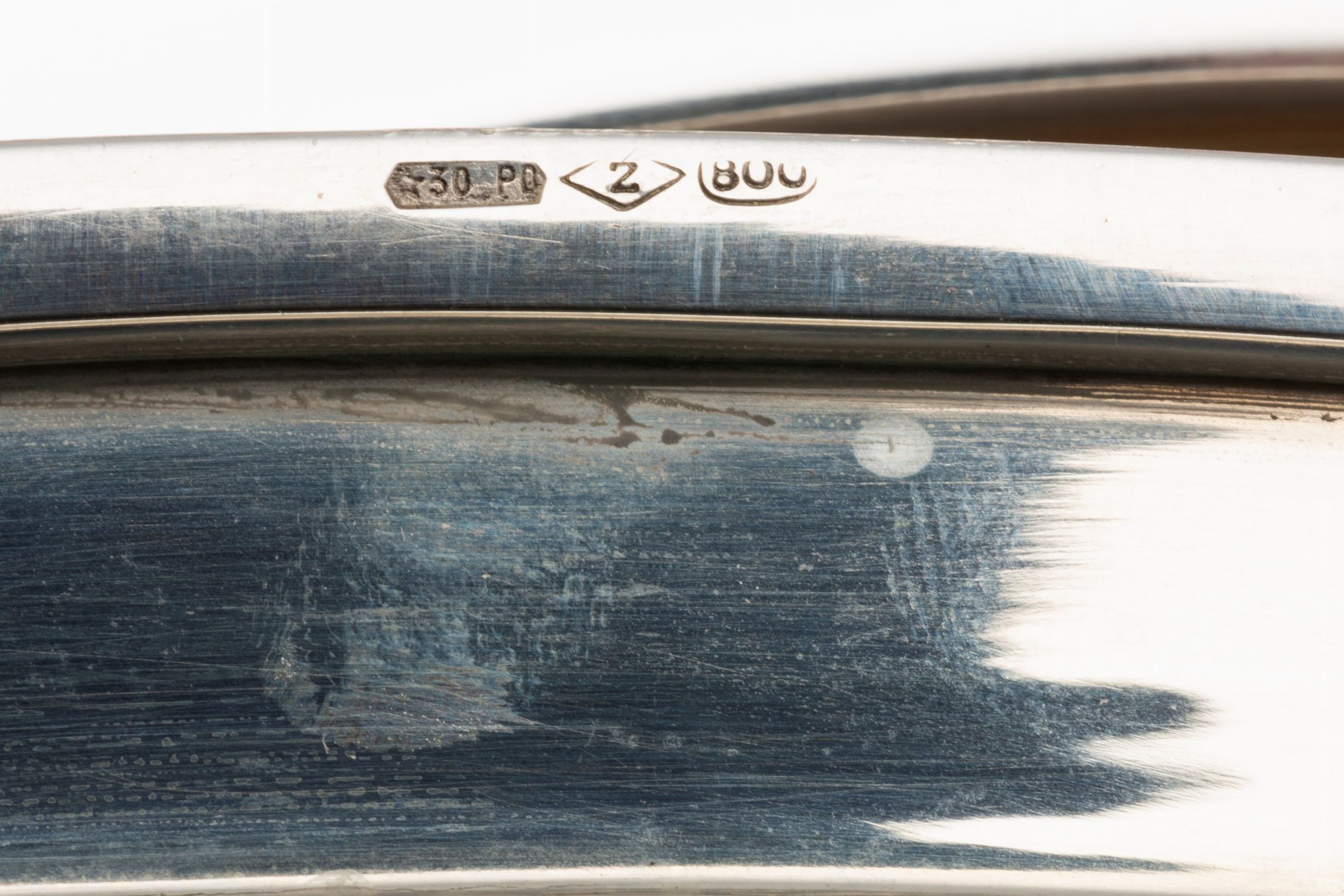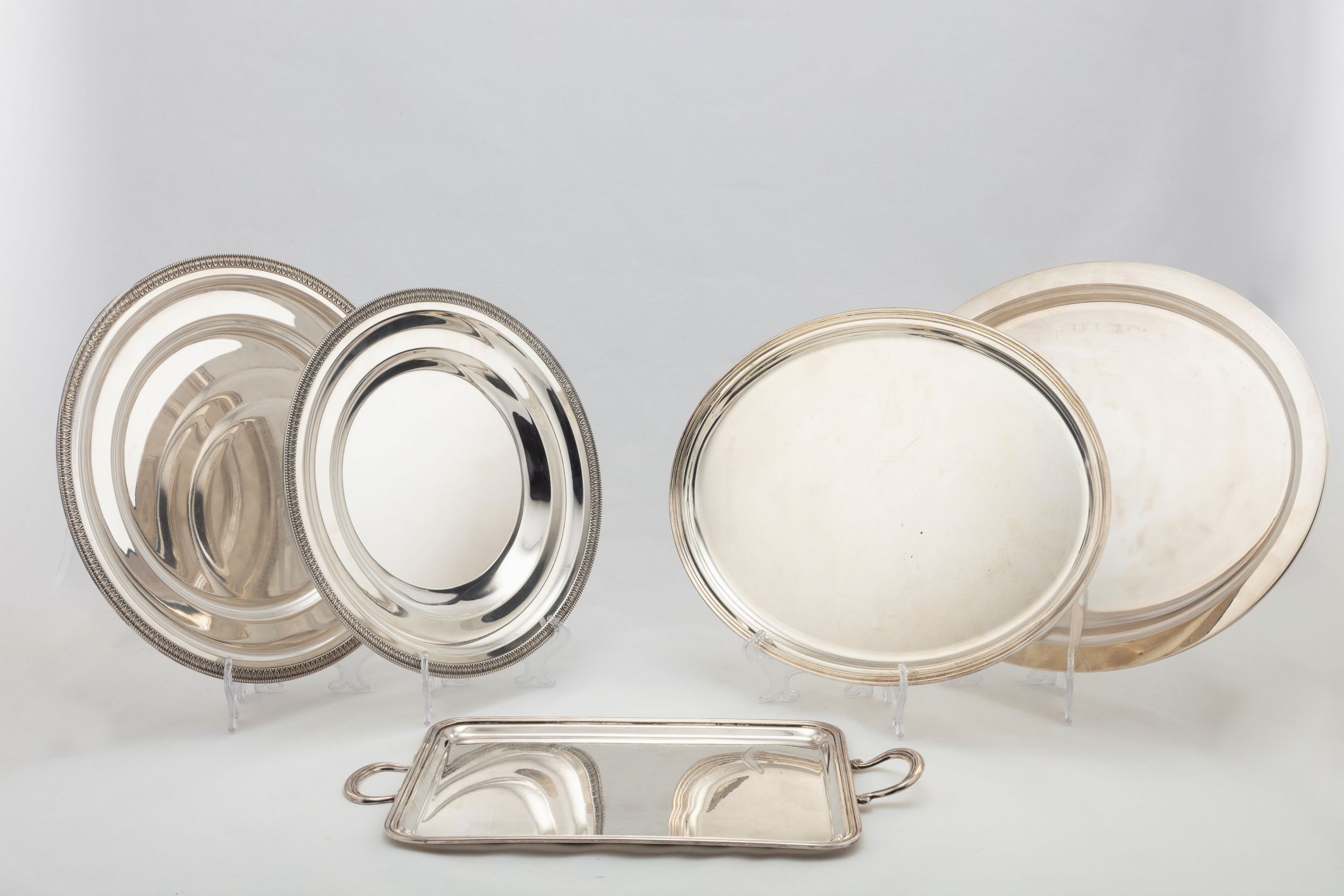 Italia, secolo XX composto da due sottopiatti circolari con bordo inciso (d cm 32,00 e 29,50), due vassoi ovali (l cm 37,50 e 41,50), un vassoietto rettangolare biansato, difetti (manico dissaldato, l cm 39,00).