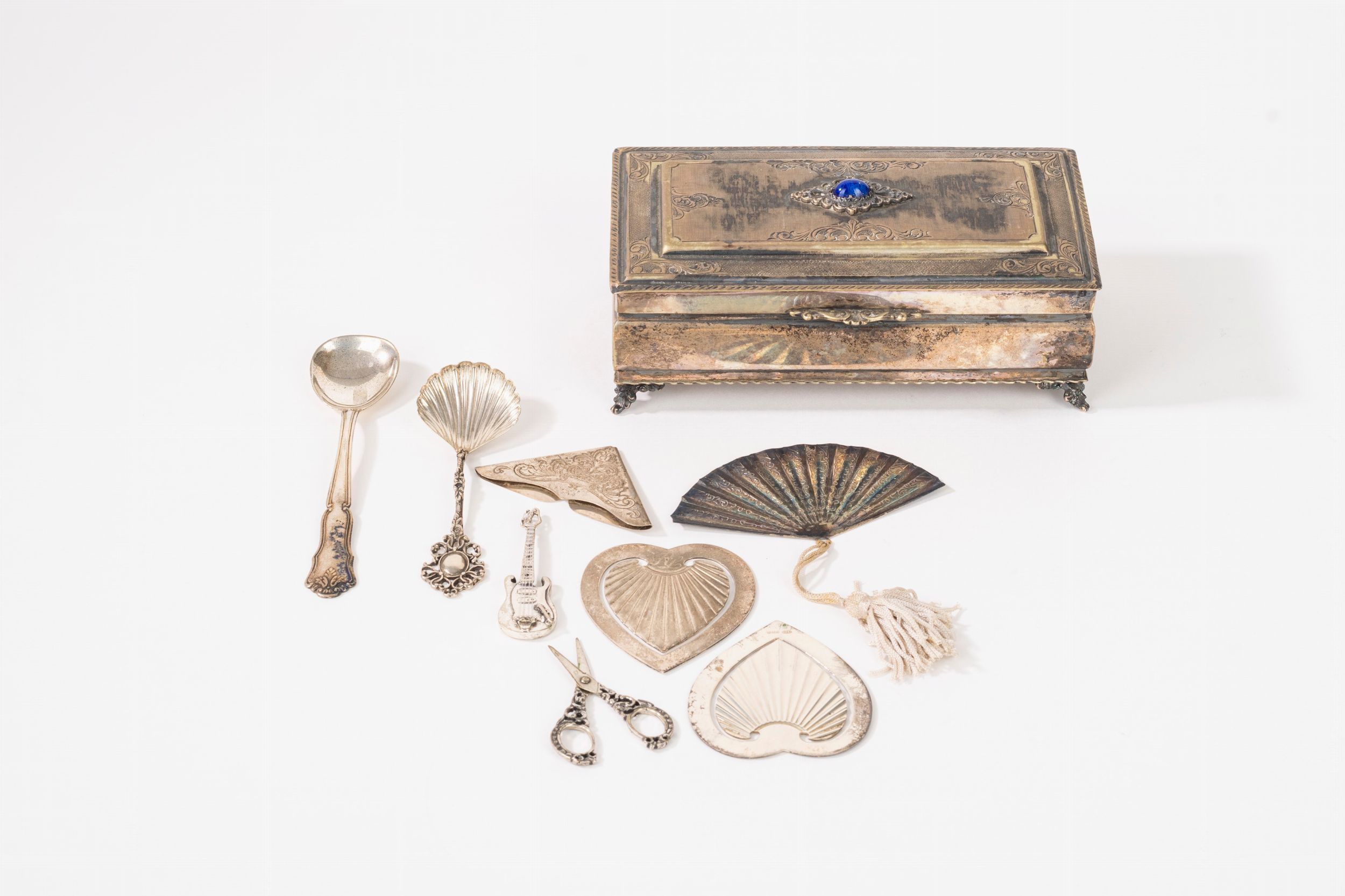 Italia, secolo XX composto da scatola portagioie in argento e vermeil con decorazione in lapislazzuli e piedini a motivi vegetali, una piccola forbice, due cucchiaini, tre fermacarte, un soprammobile a foggia di piccola chitarra e un ventaglio.