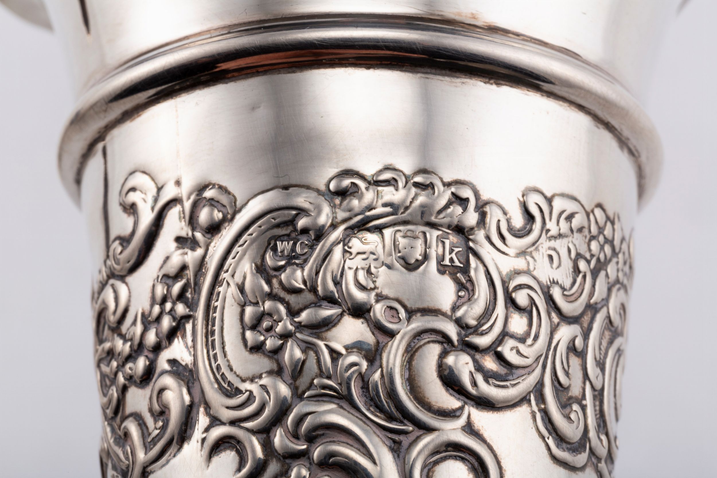 Italia e Inghilterra, secolo XX composto da un vaso cilindrico sbalzato, marchi di Londra 1905, argentiere WC (William Comyns & Sons?), un bicchiere inciso con motivi floreali, punzonato Cusi Milano 925, una fiasca a decori incisi (apparentemente priva di punzonatura), e un piccolo vaso scanalato.