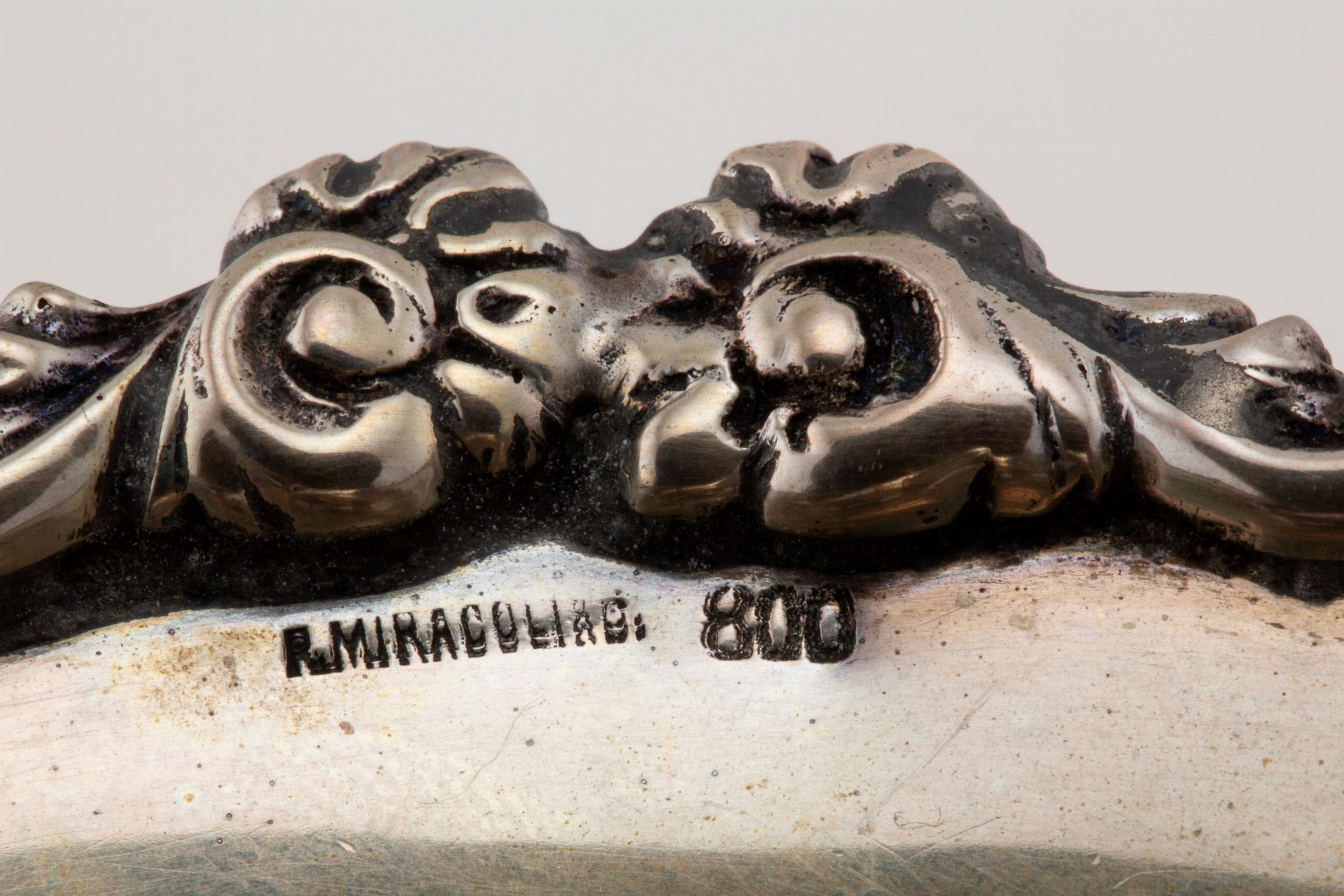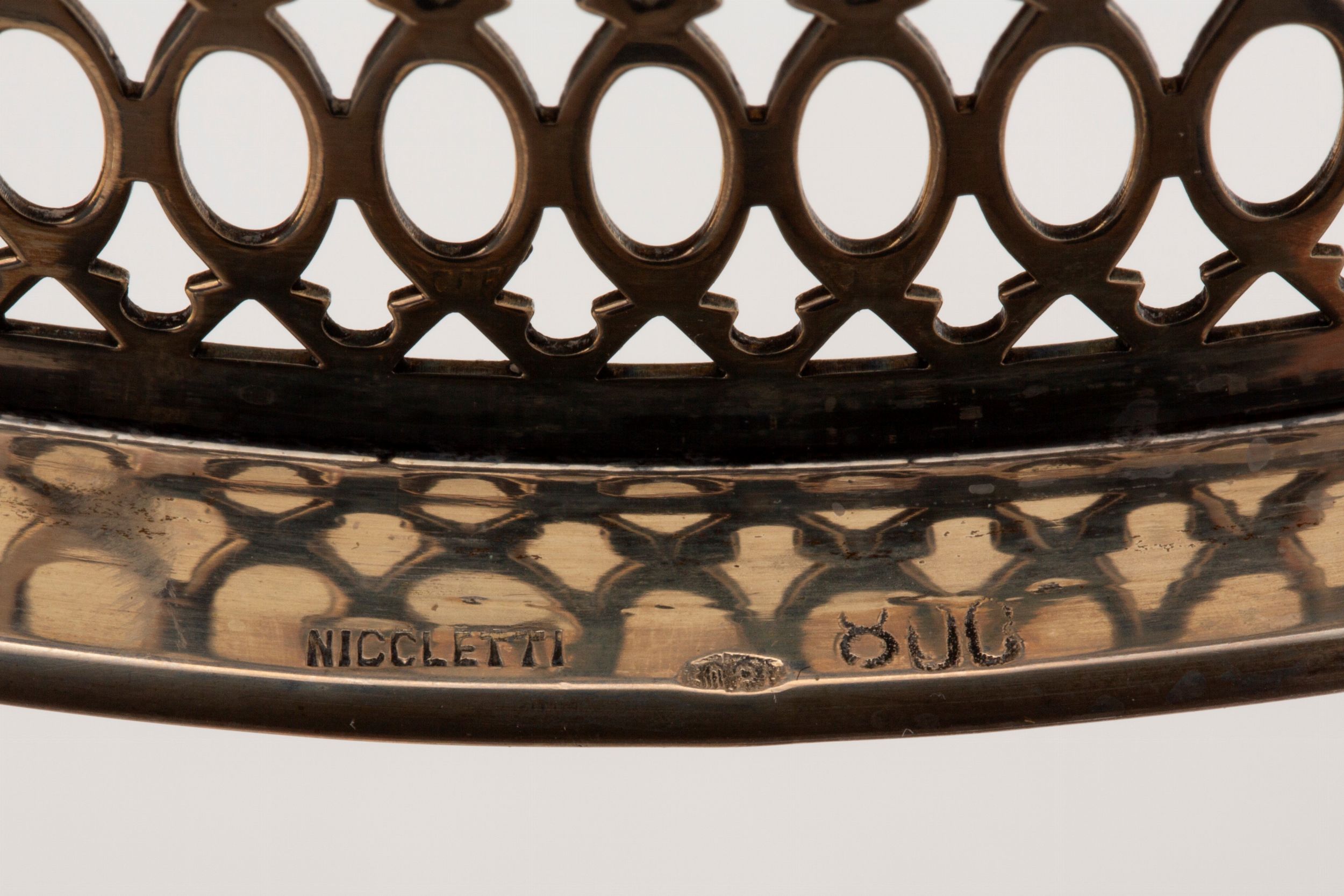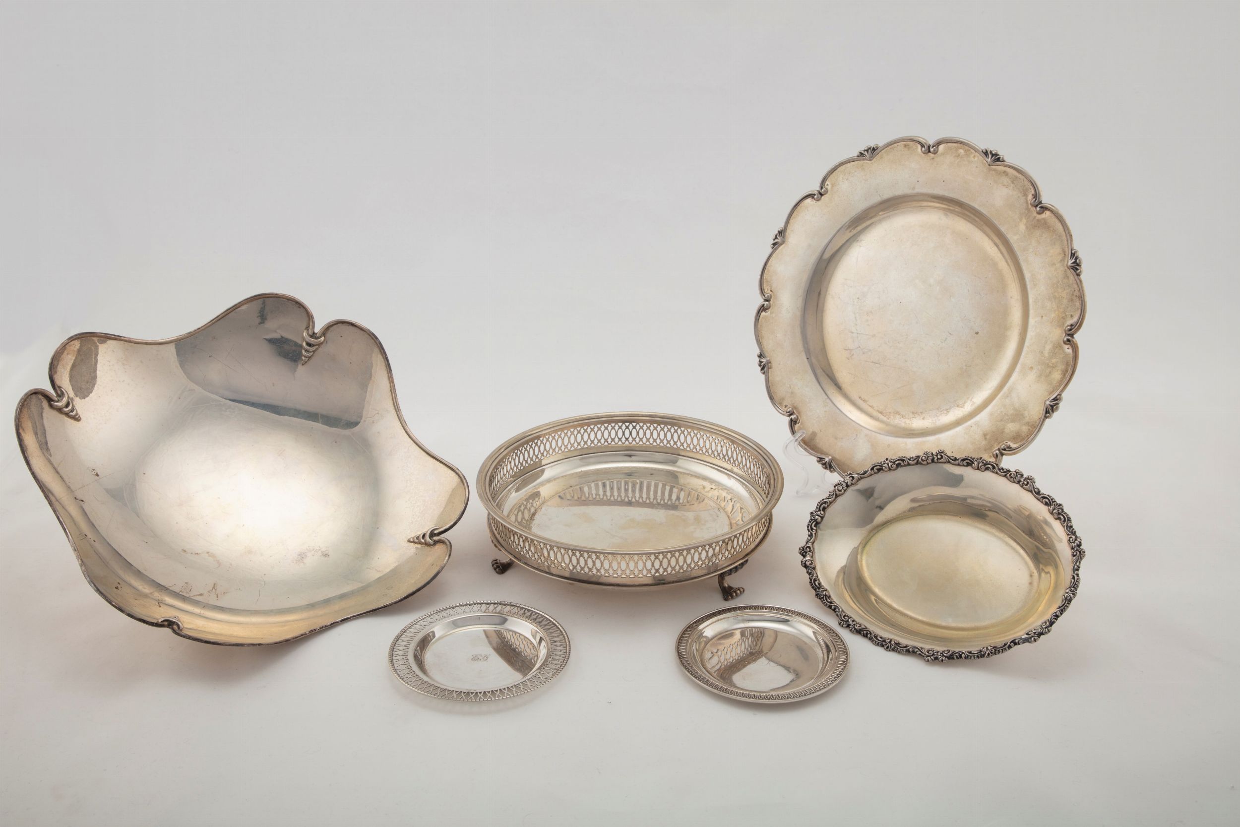 in argento, Peso kg 1,594 l max cm 29,80 Italia, secolo XX composto da un'alzatina circolare con bordo reticolato poggiante su tre piedini ferini (Nicoletti Roma), un centrotavola polilobato poggiante su quattro piedini, un piatto circolare a bordo mistilineo, un vassoietto con bordo cesellato con motivi floreali (Miracoli Milano) e due piattini monogrammati.