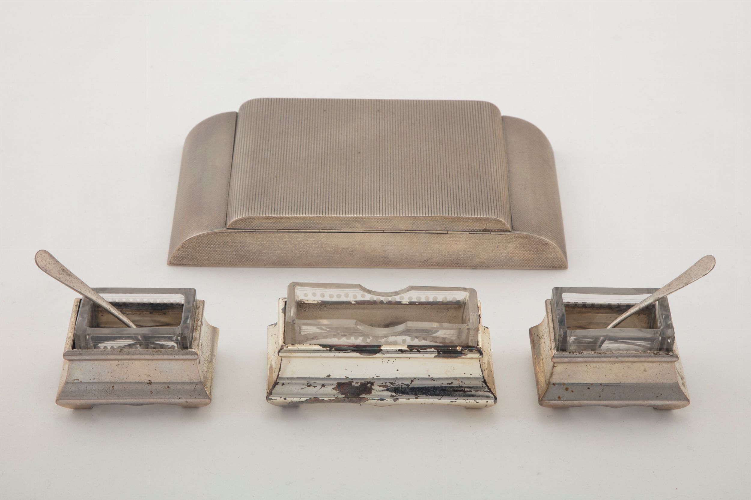 Italia, secolo XX composto da scatola porta sigari da tavolo con interno in legno (l cm 21 ,00 x p 10,50), tre saliere con due cucchiaini.