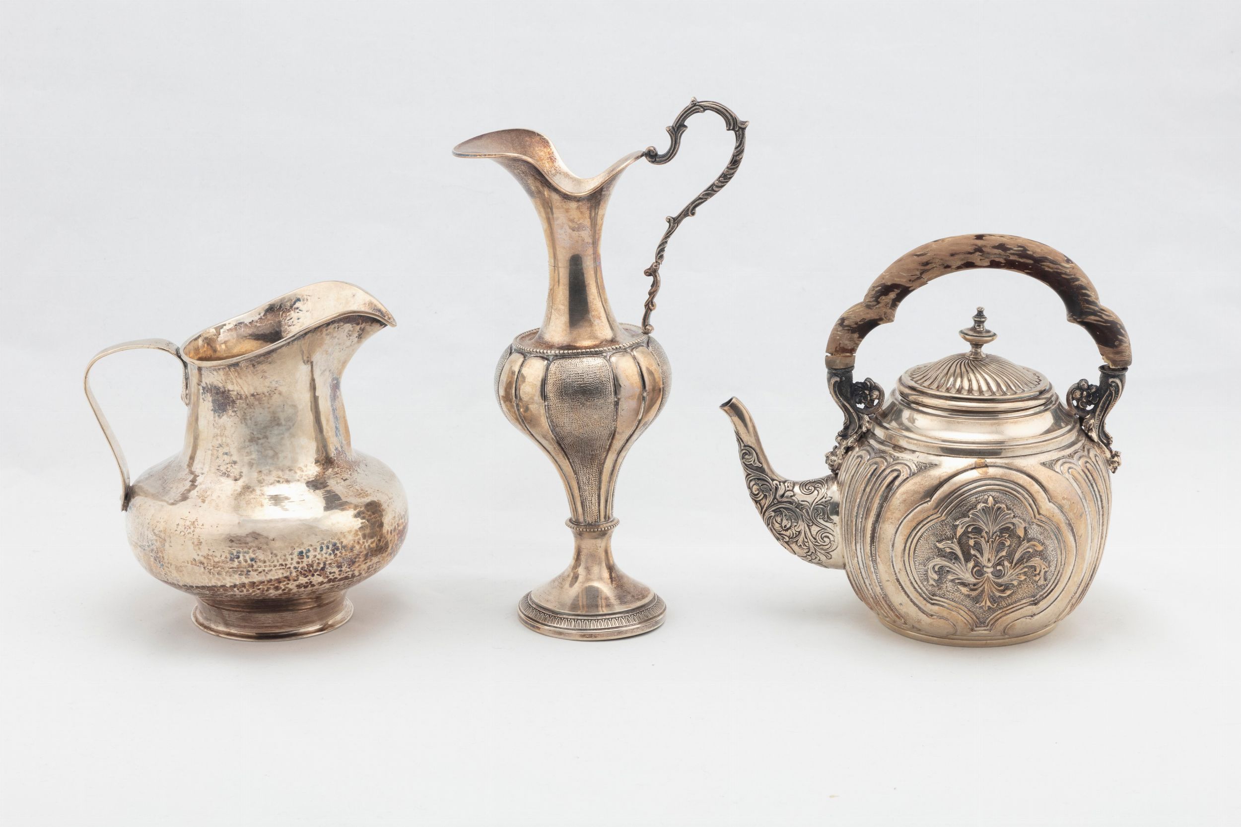 Italia, secolo XX la brocca martellata Cassetti Firenze (h cm 19,00); la teiera sbalzata e cesellata con decori floreali, manico in legno (h cm 18,00), difetti; il vaso baccellato e cesellato, difetti (ammaccatura alla base) (h cm 29,00).