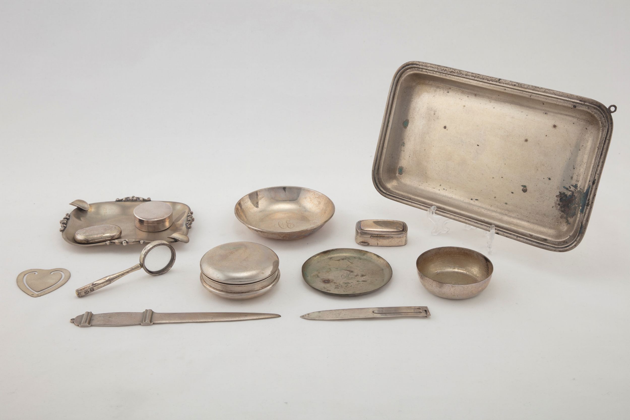 Italia, secolo XX composto da un vassoietto rettangolare, un posacenere lobato e uno circolare, tre portapillole, una scatola, due tagliacarte, una lente, un fermacarte a forma di cuore e due ciotoline.