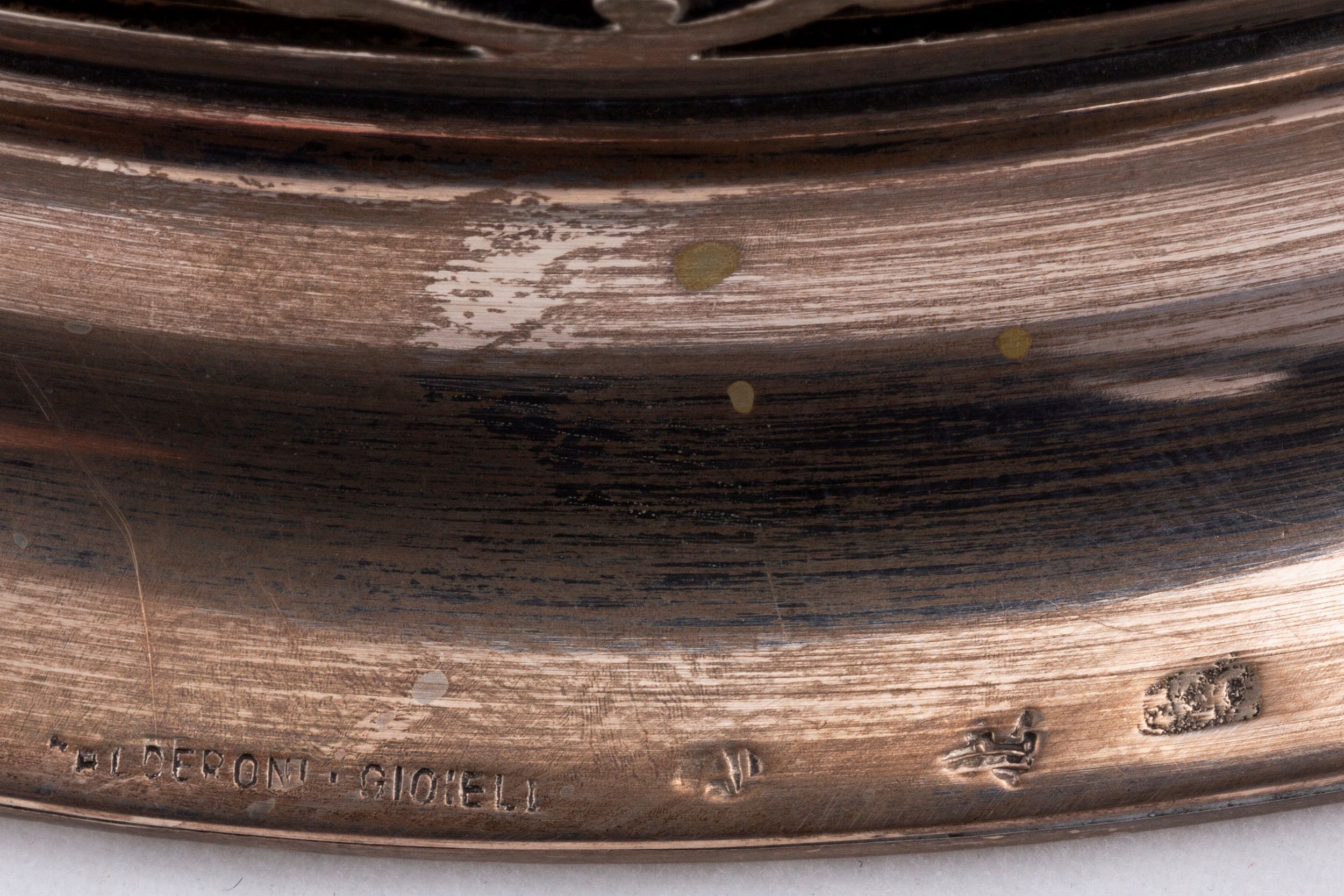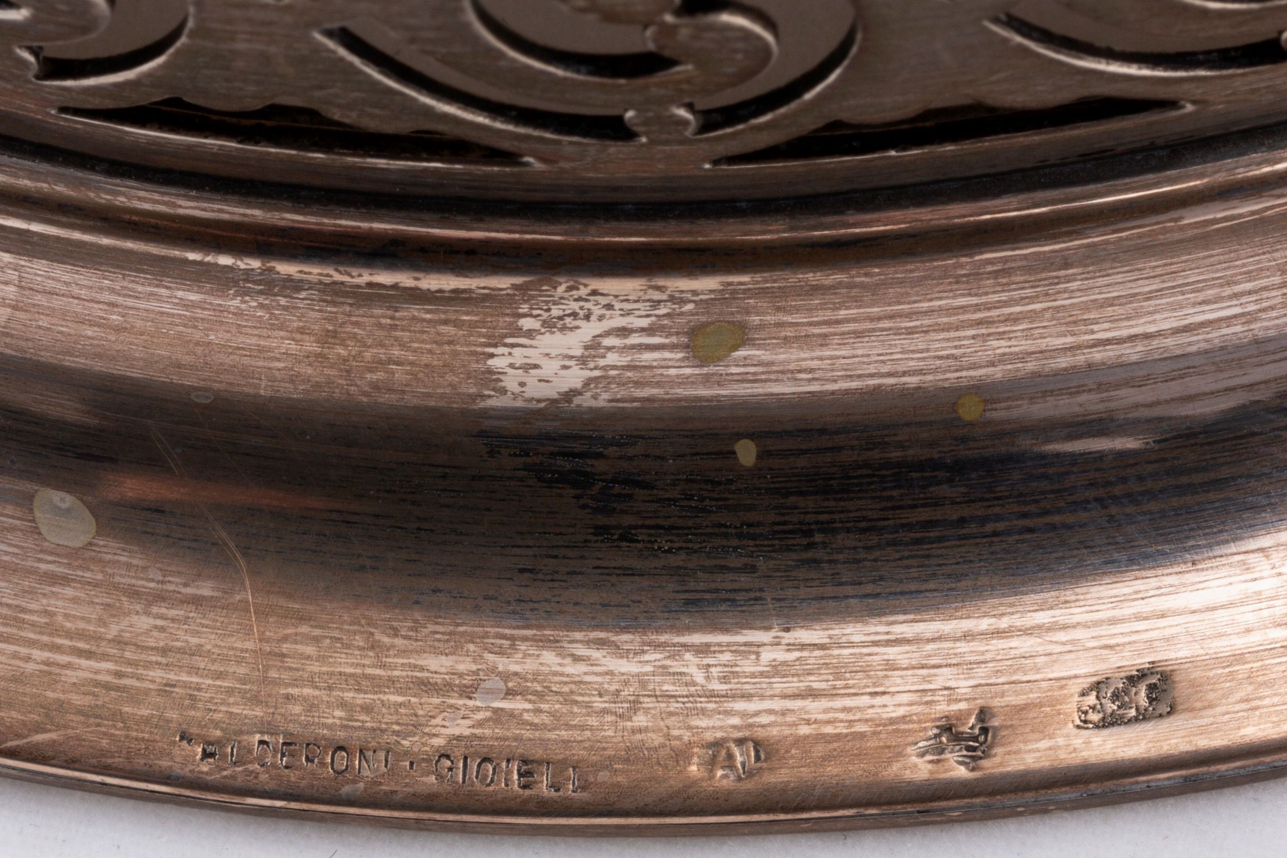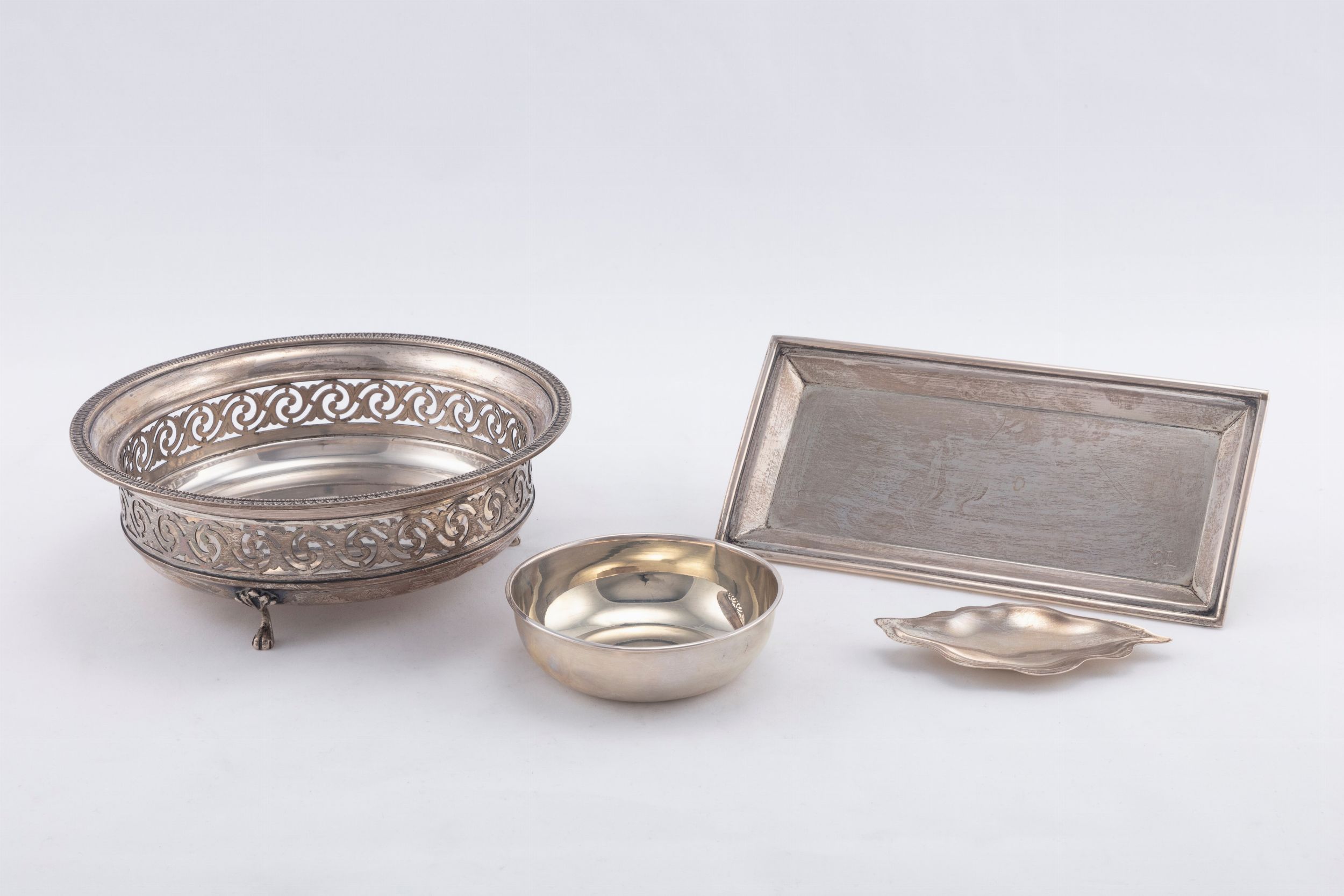 Italia, secolo XX composto da un posacenere De Vecchi, uno svuotatasche Faraone, un vassoietto Miracoli e un'alzatina reticolata Cesa per Calderoni Gioielli.