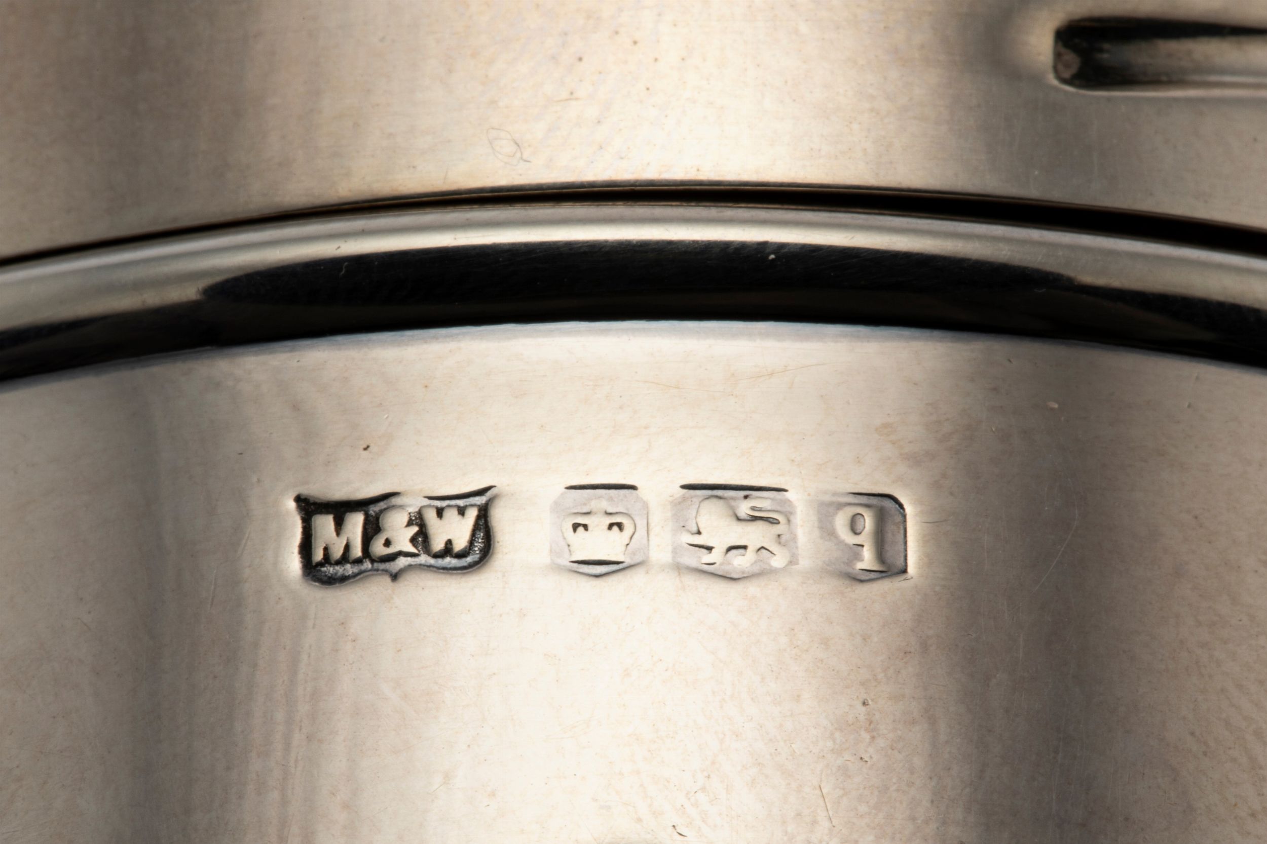 in argento 925, Peso lordo g 274,00 Inghilterra, secolo XIX/XX la fiaschetta con corpo cilindrico argentiere WNGN ( W & G Neal), Londra 1898 (tappo interno in legno e ammaccature sul corpo); la scatola circolare punzoni dell'argentiere Mappin & Webb, città di Sheffield 1933, incisione sul coperchio 'N.C.H Puppy Show 1934'.
