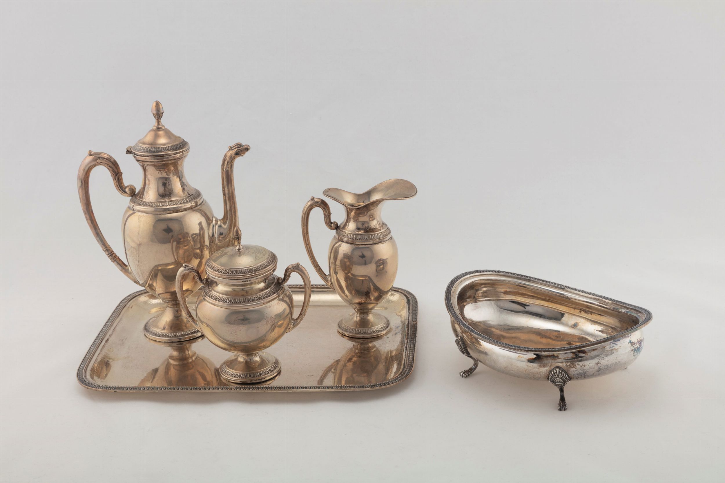 Italia, secolo XX il servizio composto da teiera, zuccheriera, versatoio e vassoio rettangolare (l cm 34,00 x p 26,00) con decoro a palmette e un porta bon bon con quattro piedini ferini e bordo a palmette (l cm 21,00 x h 6,80).